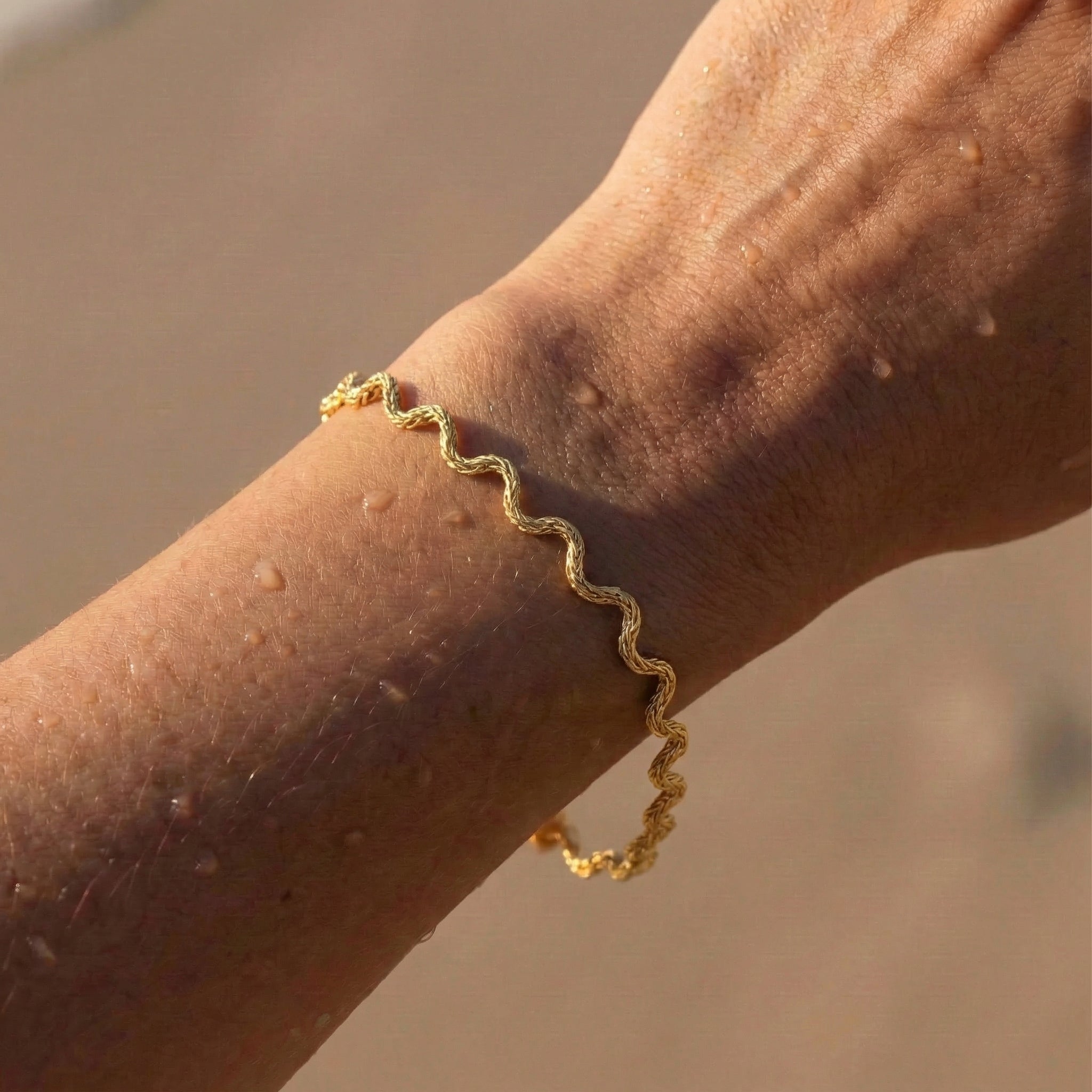 Delicate and fluid, the Odina Wave Bracelet is inspired by the movement of the sea. Its twisted wave silhouette catches the light beautifully, bringing effortless coastal elegance to everyday styling. Minimal yet feminine, it’s a timeless piece designed to layer seamlessly or shine on its own.