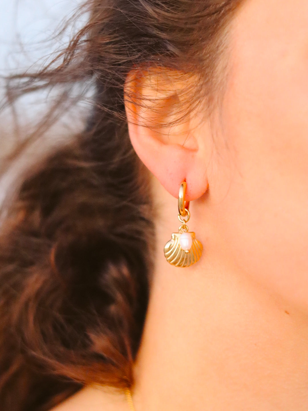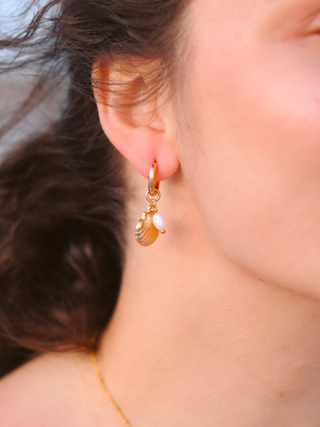 A delicate duo of the sea. Featuring a petite pearl and a dainty shell charm, these earrings bring effortless coastal elegance to every look.