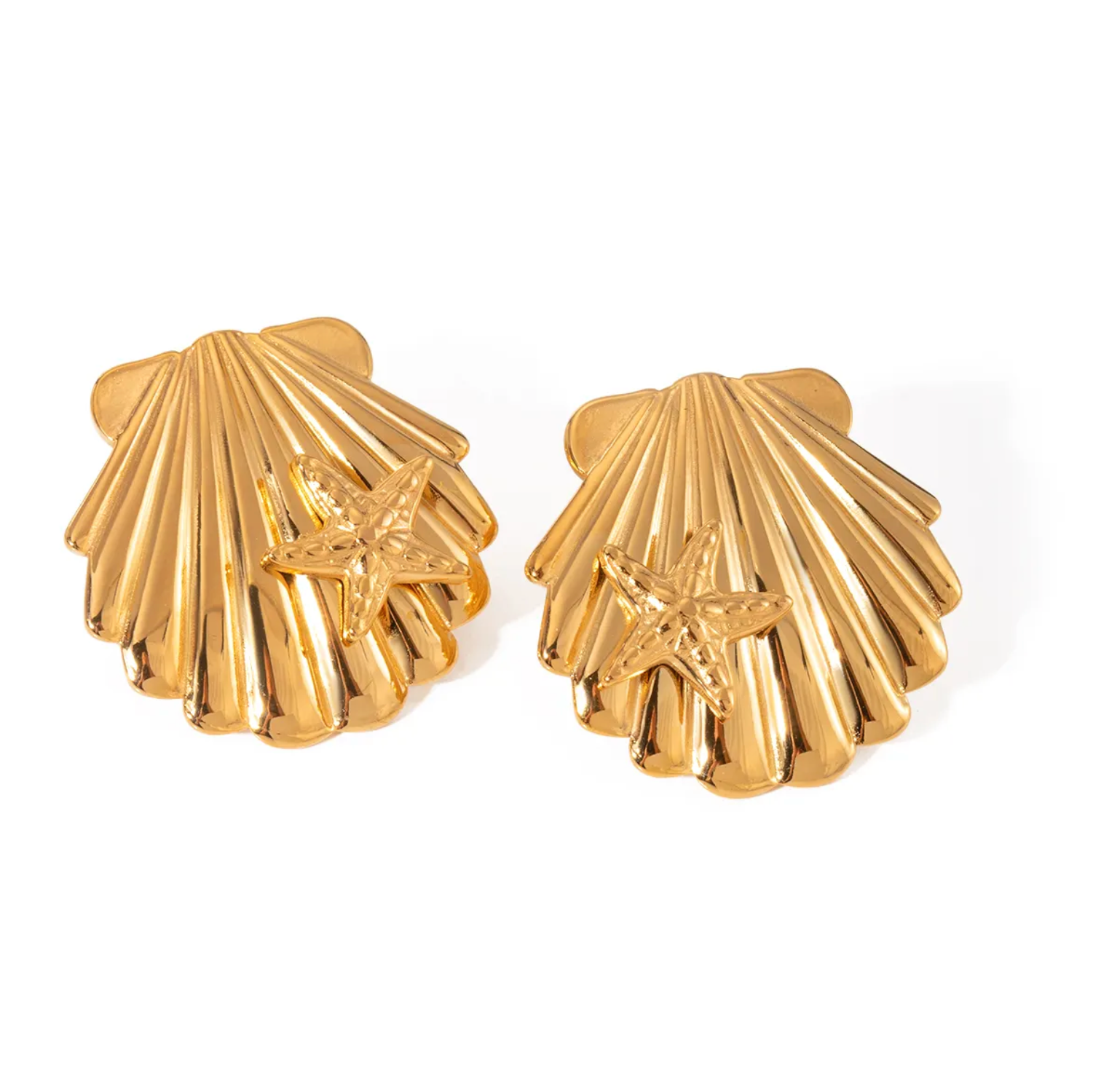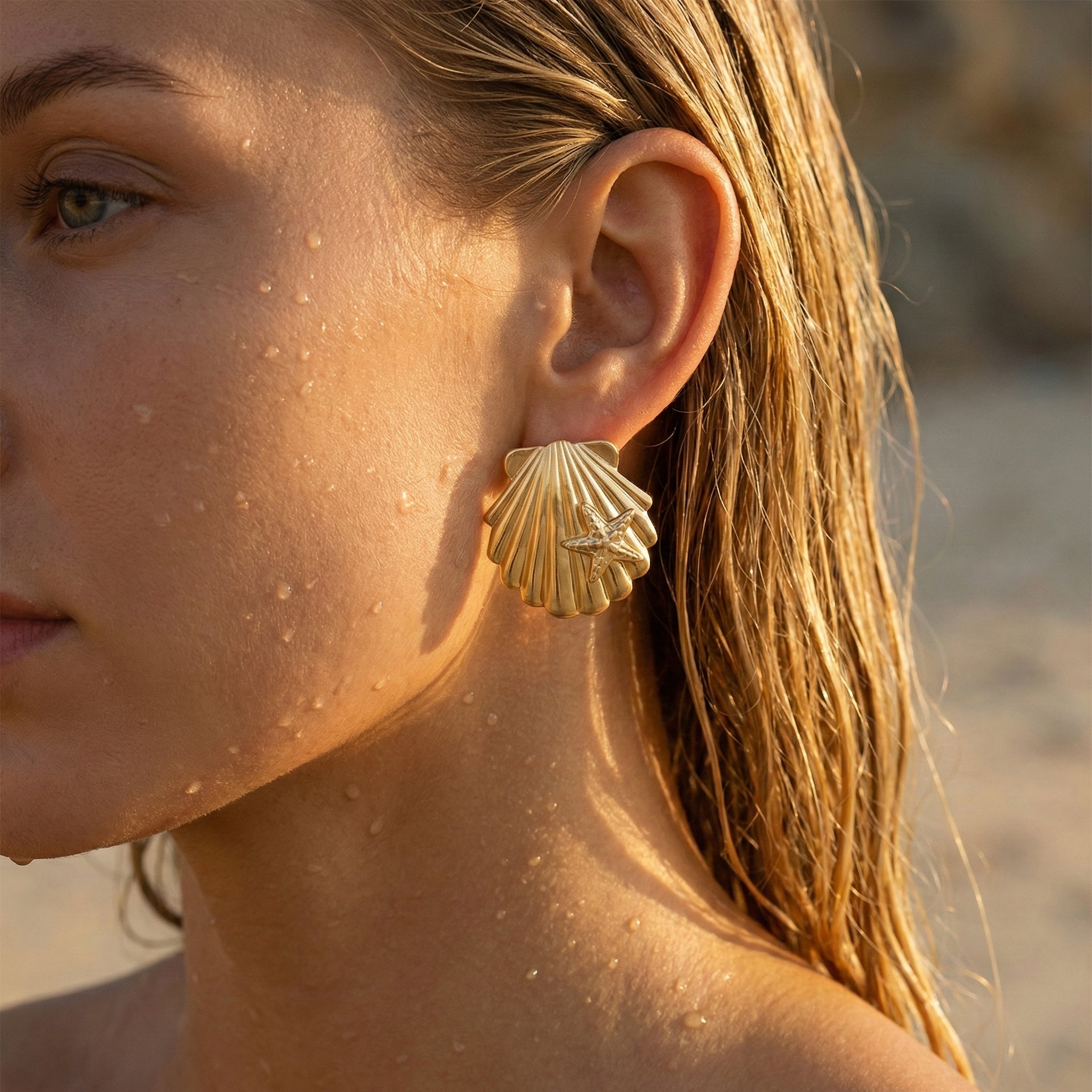 Bold, coastal, and impossibly chic, these shell statement studs feature a sculptural seashell silhouette finished with a dainty starfish detail for the perfect touch of ocean charm. High-shine and eye-catching, they’re made for vacation nights, beachside dinners, and elevating any simple look.