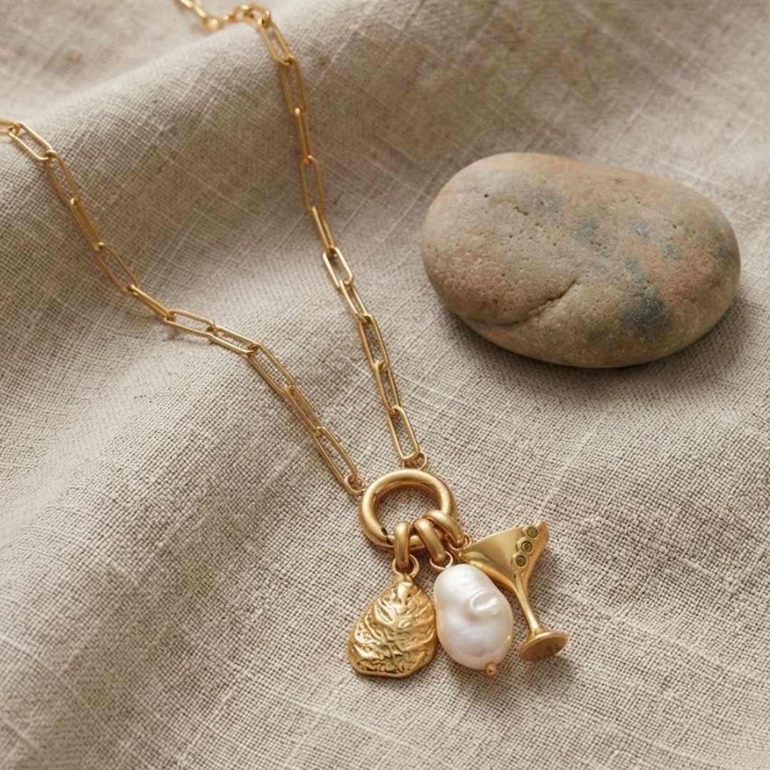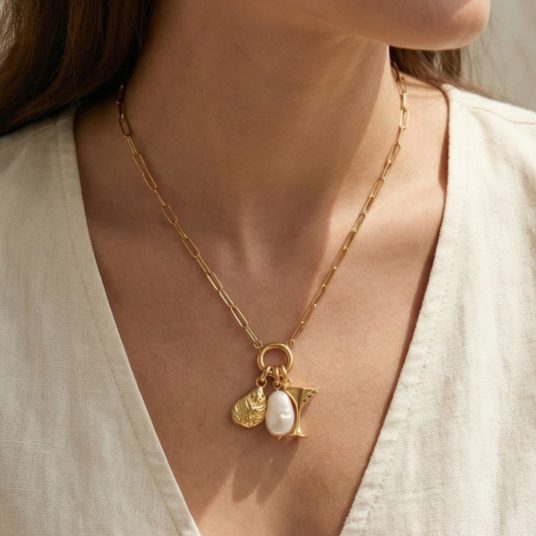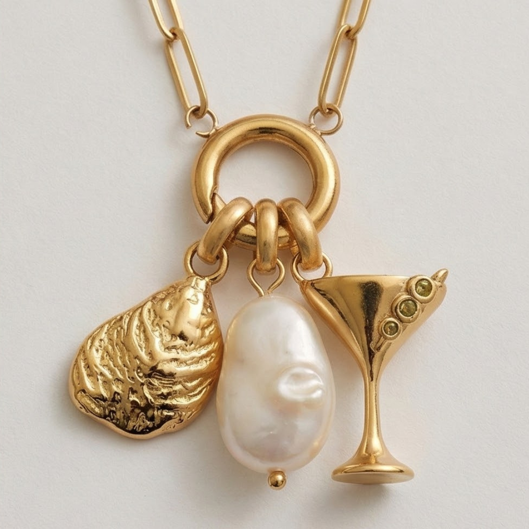 The centerpiece of this necklace is our exclusive Liv Bella Vita martini charm, meticulously crafted with three shimmering zircon stones that represent the olives of a perfect martini. The charm also features an oyster charm, symbolizing the essence of luxury and refinement, and a genuine freshwater pearl, adding a touch of natural beauty.