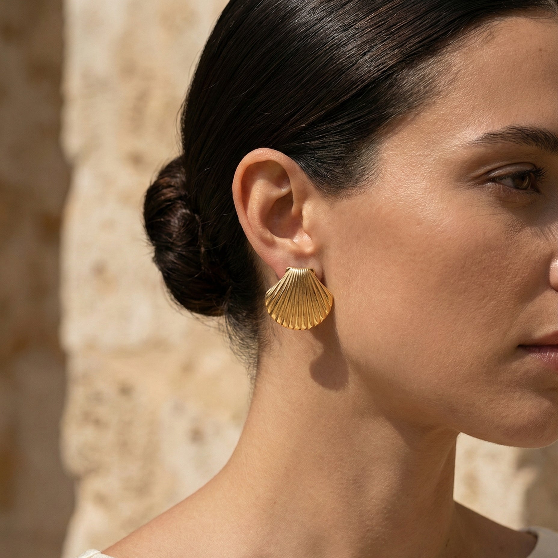 Make waves with the Delphine Shell Stud Earrings, a sculptural take on coastal elegance inspired by the natural beauty of seashells. Finished in waterproof gold, these statement studs bring effortless oceanic charm to everyday styling.