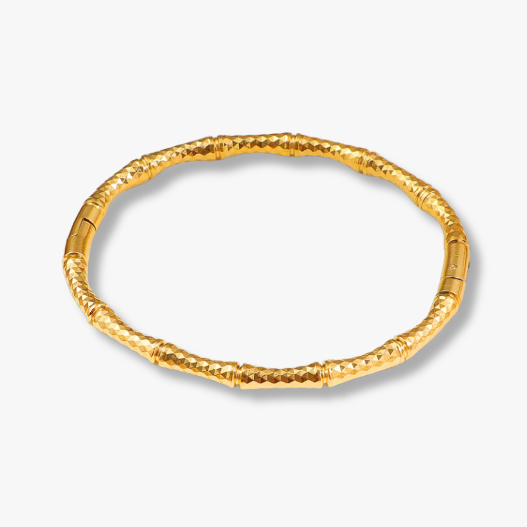 Crafted from 316L stainless steel and finished with 18K gold PVD, this bangle is waterproof, hypoallergenic, and tarnish-free — made to withstand every adventure, wave, and golden sunset.