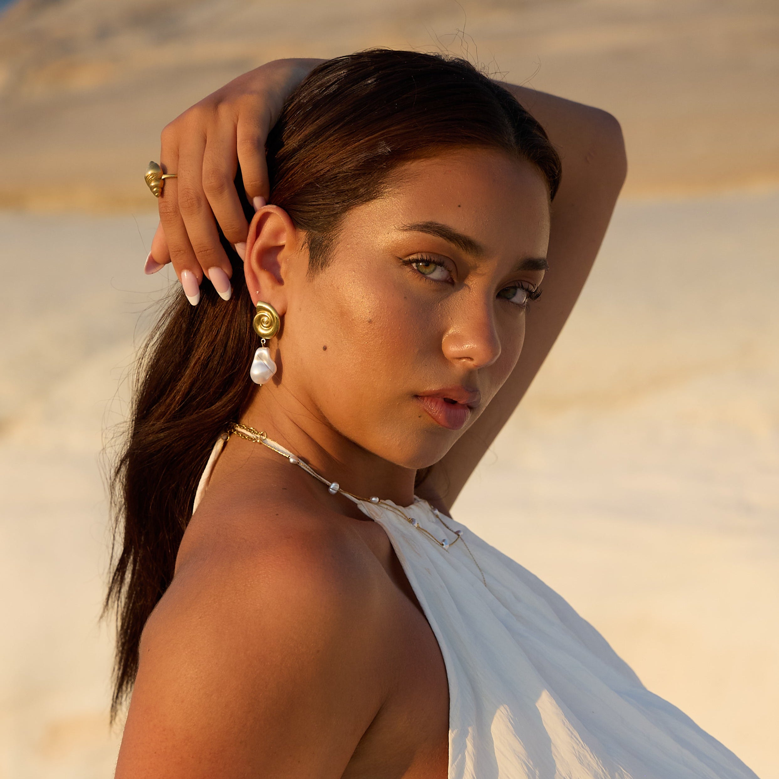 Our jewelry is crafted with 18k PVD gold over 316L stainless steel — a durable, waterproof, and hypoallergenic base made to shine through salt, sweat, and everyday wear. We never use brass, copper, or nickel, so your pieces stay radiant and irritation-free.