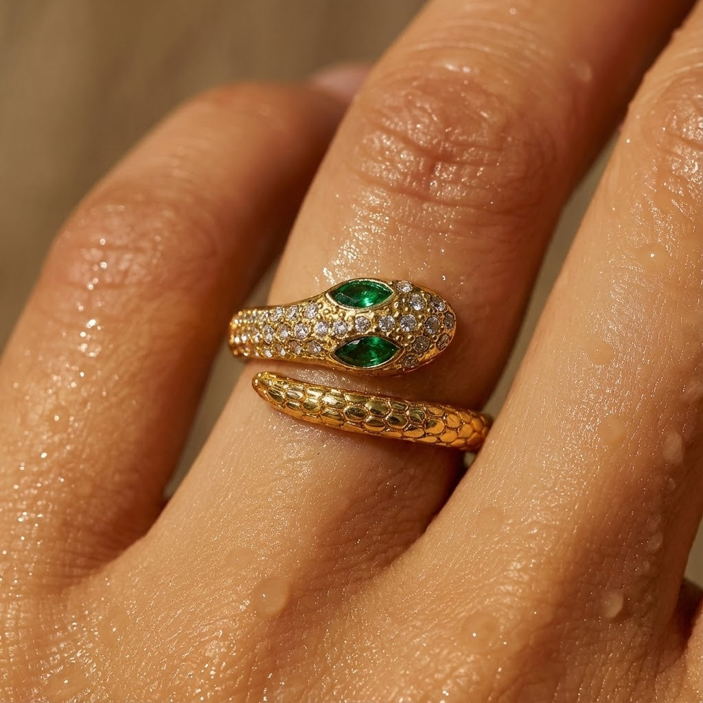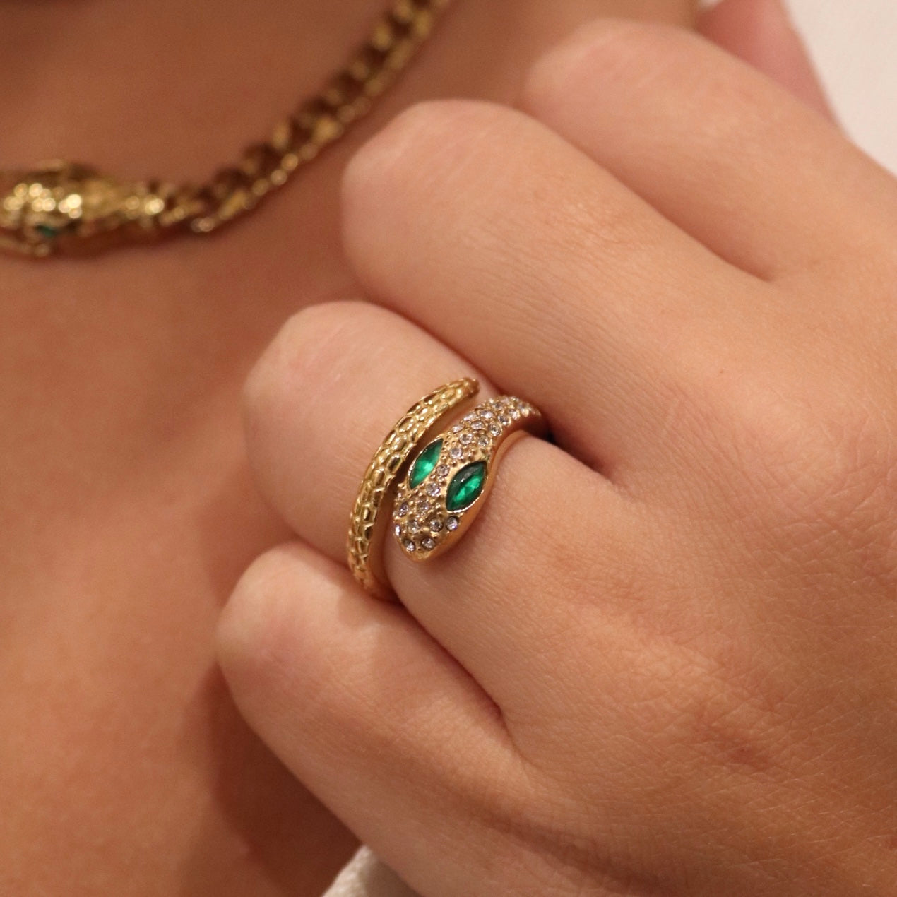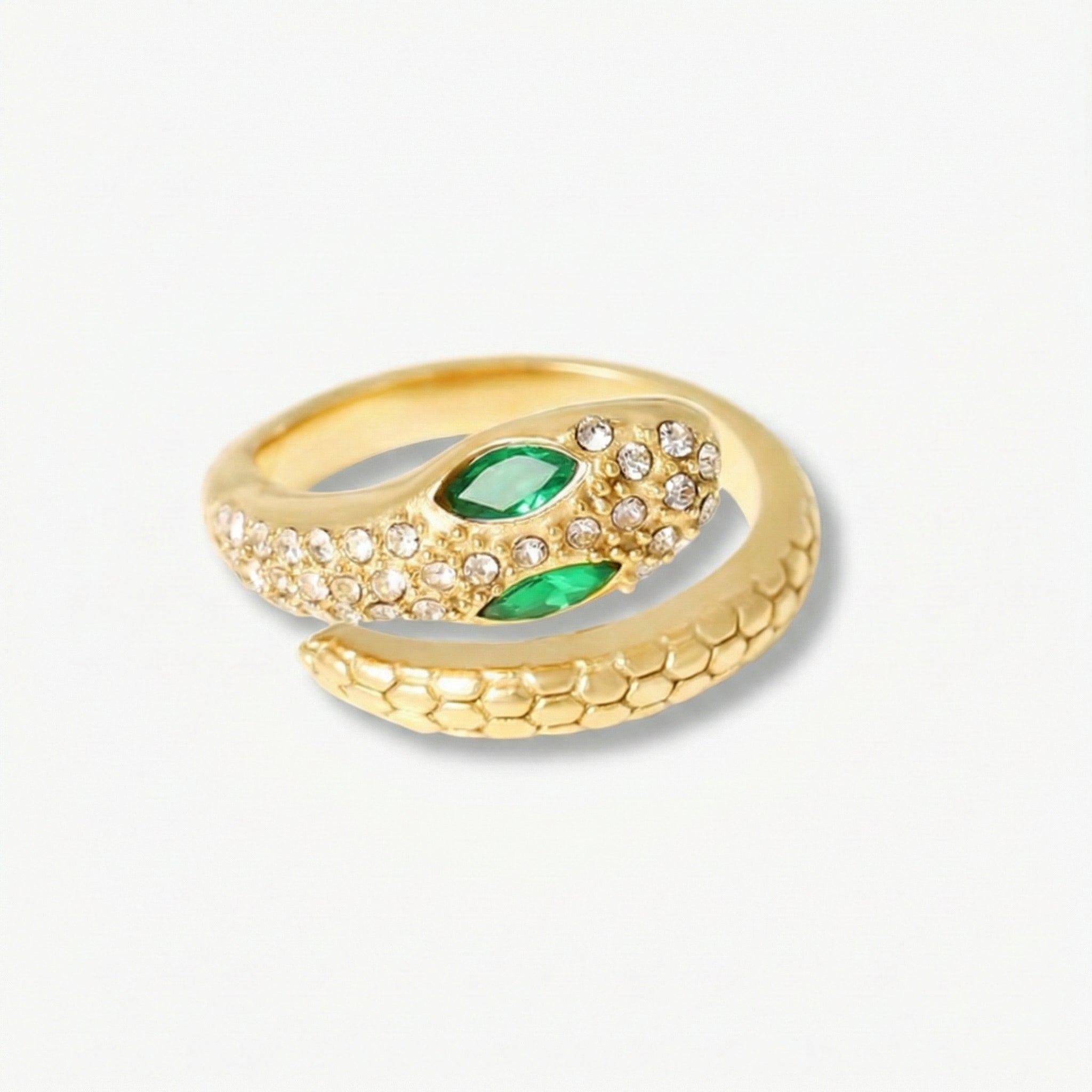Bold and captivating, this open gold ring features a serpent-inspired design accented with shimmering clear stones and vibrant green details for a striking, confident finish.