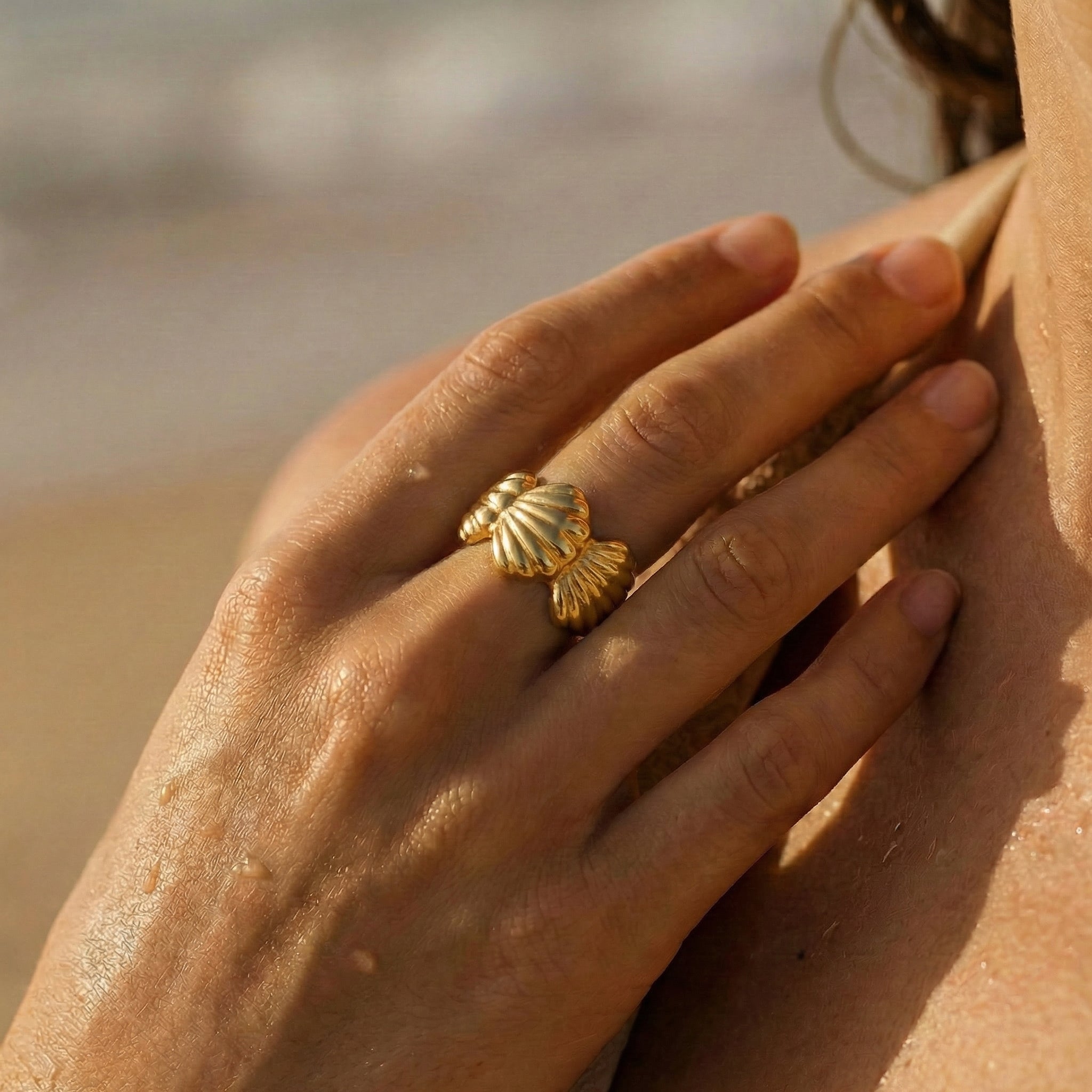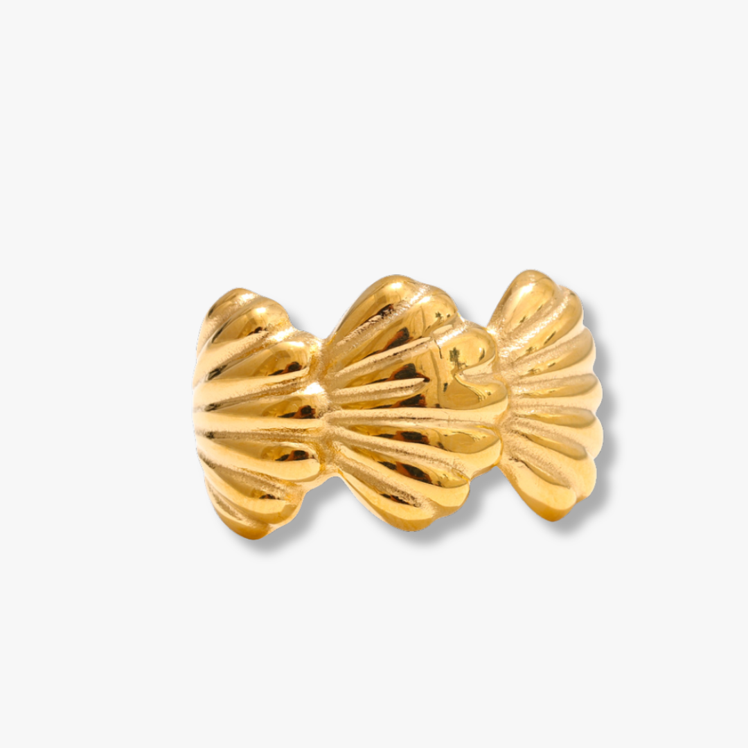 Sculptural and striking, this shell-inspired band features a fluid, ridged design that mirrors the natural curves of the sea. Finished in radiant gold, its bold silhouette feels both organic and elevated—made to stand out on its own or layered effortlessly.