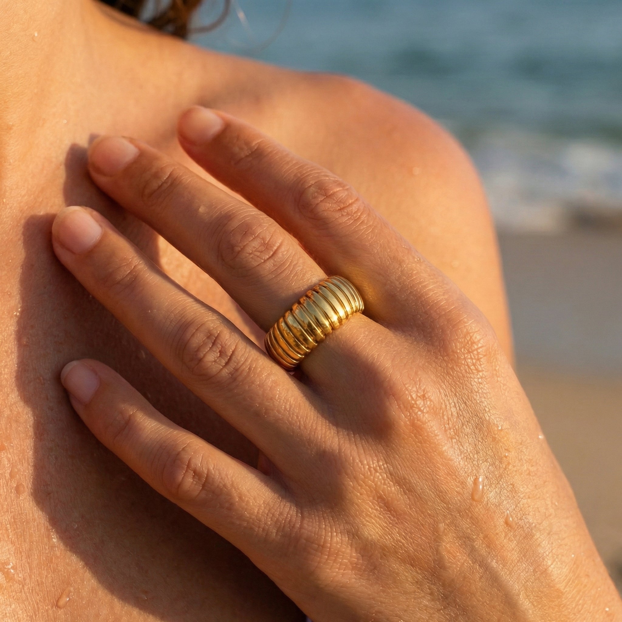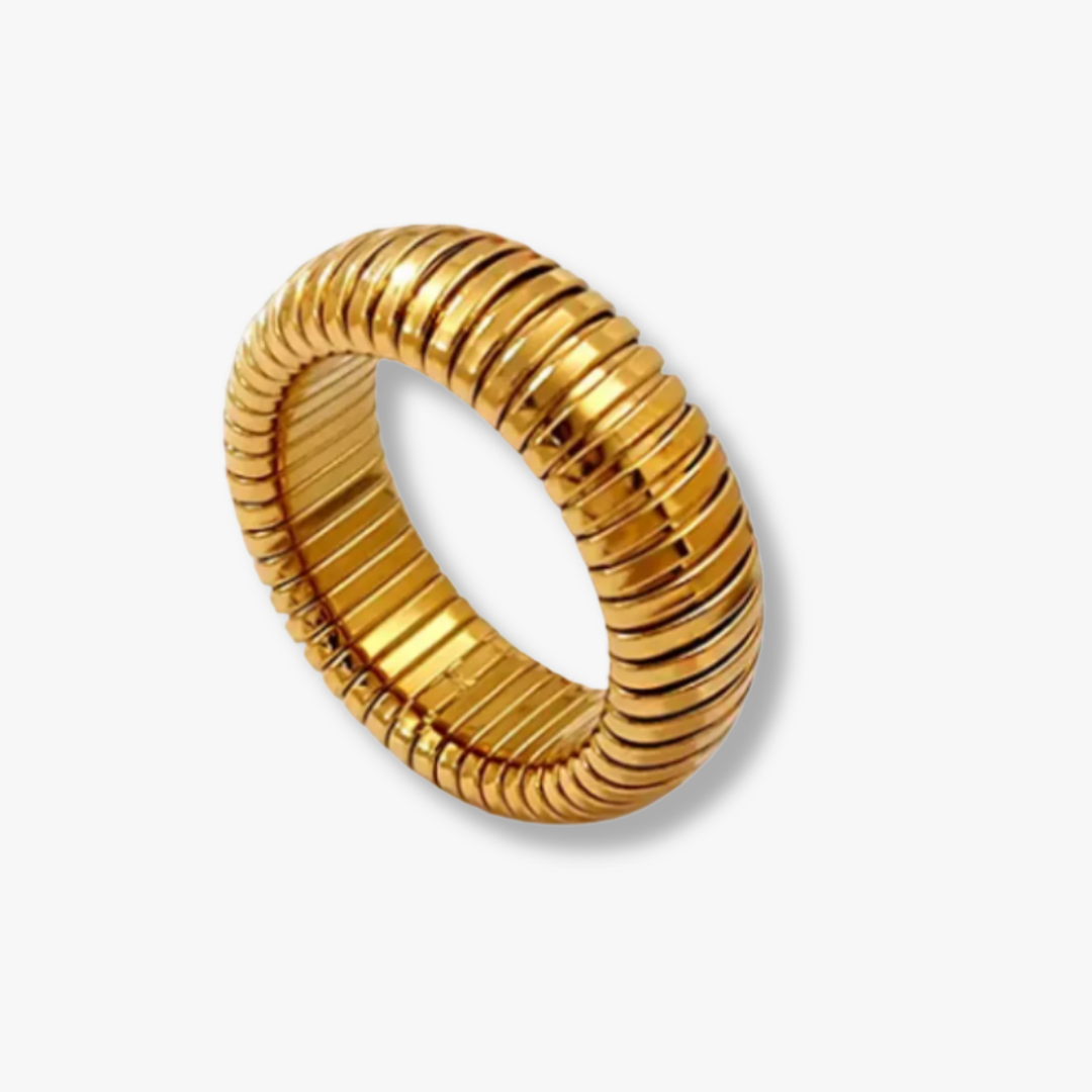 Sleek and sculptural, this ribbed gold band delivers a bold yet timeless look with its smooth, stacked silhouette. Designed to catch the light from every angle, it’s an effortless statement that works just as beautifully worn solo as it does layered.