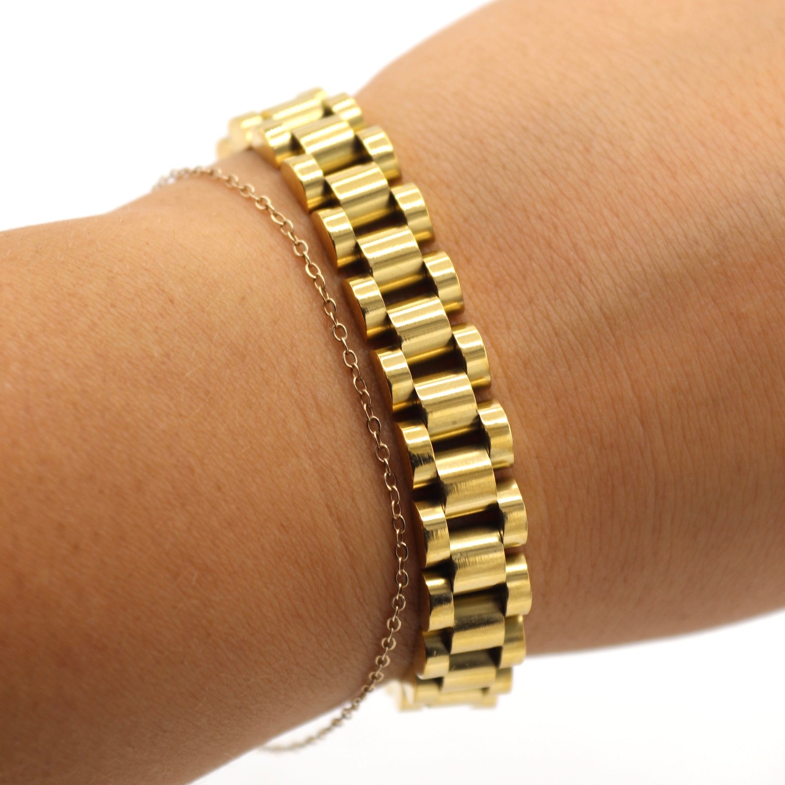 The Aubree Watchband Gold Bracelet is a stunning piece that effortlessly combines functionality with fashion.