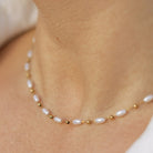 Add a touch of sophistication with the Camila Rice Bead Dainty Pearl and Gold Necklace. This exquisite piece features a delicate chain adorned with tiny, gleaming pearl rice beads, crafted from high-quality, PVD plated 316L stainless steel with an 18k gold finish. A single, pearl adds a touch of understated elegance, making it perfect for elevating your everyday look.