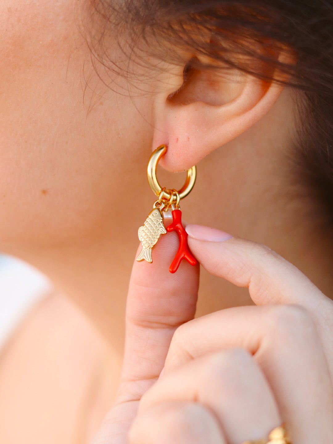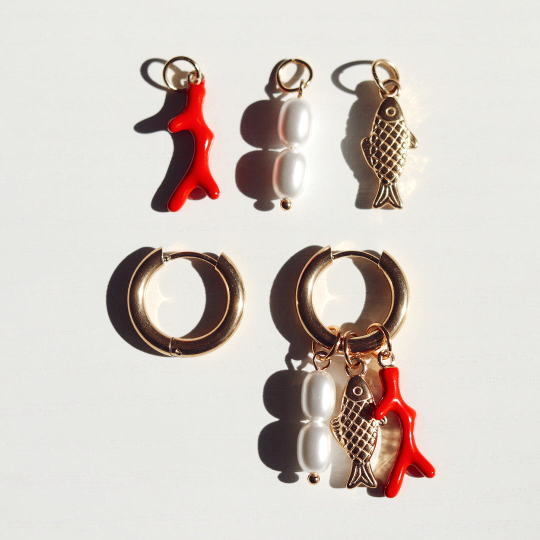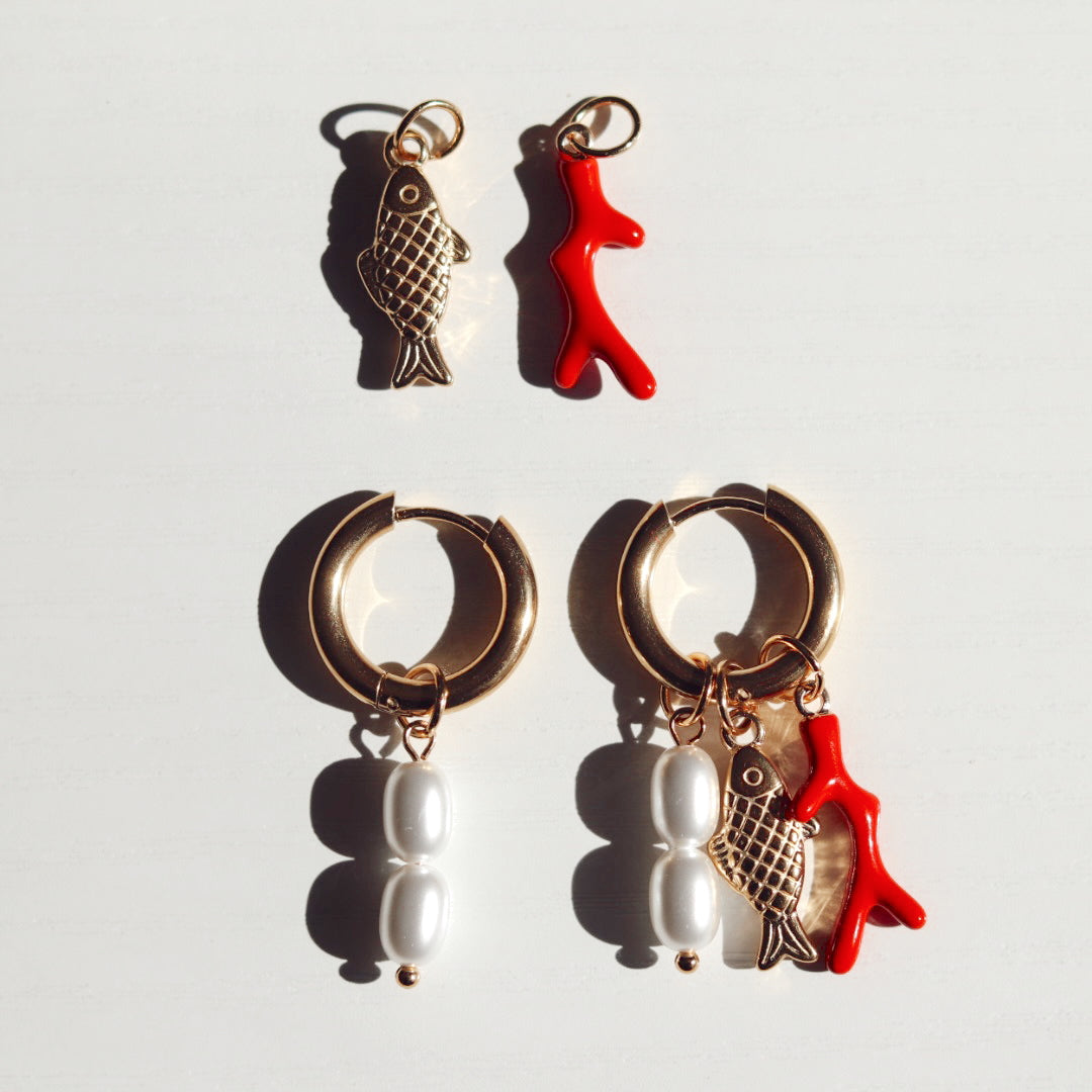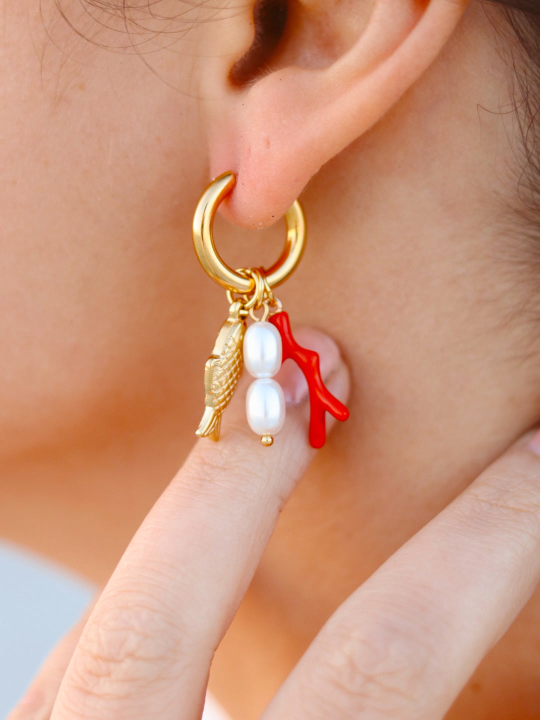 Dive into effortless style with our Capri Coast Charm Earrings—your ultimate vacation accessory. Featuring a playful trio of charms—a shimmering sardine, vibrant red coral, and a lustrous pearl—these earrings bring a touch of the Mediterranean wherever you go. Customize your look by mixing and matching the removable charms, perfect for transitioning from a beach day to a night out.