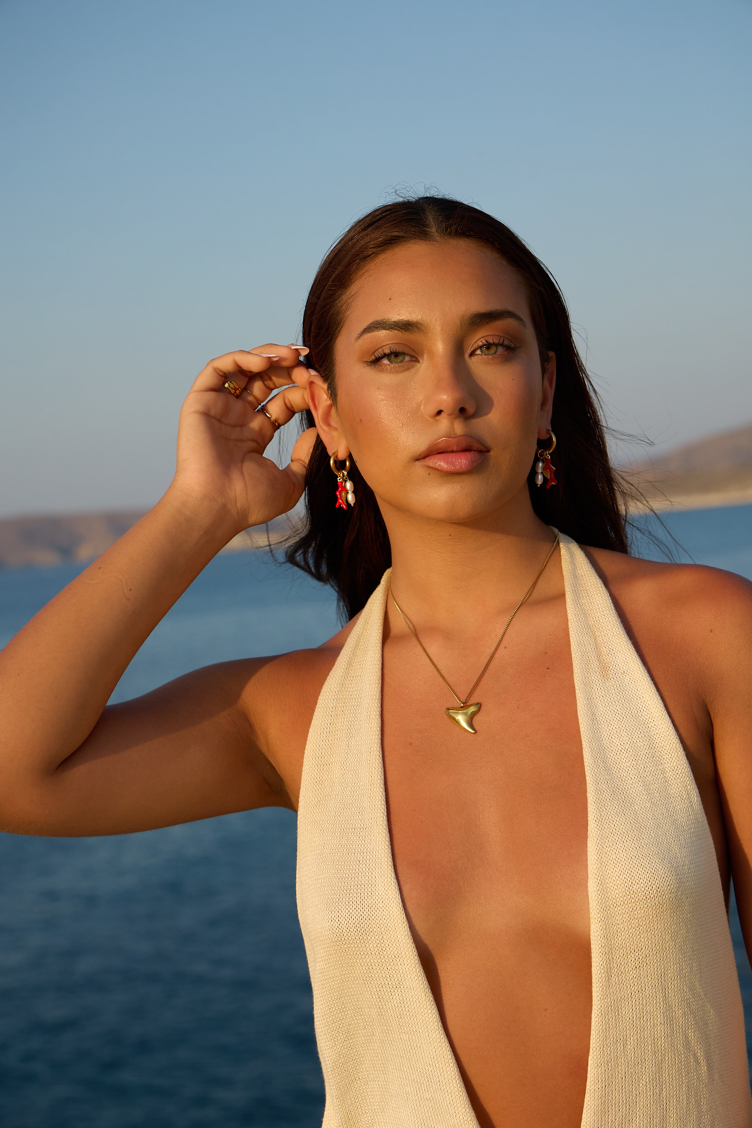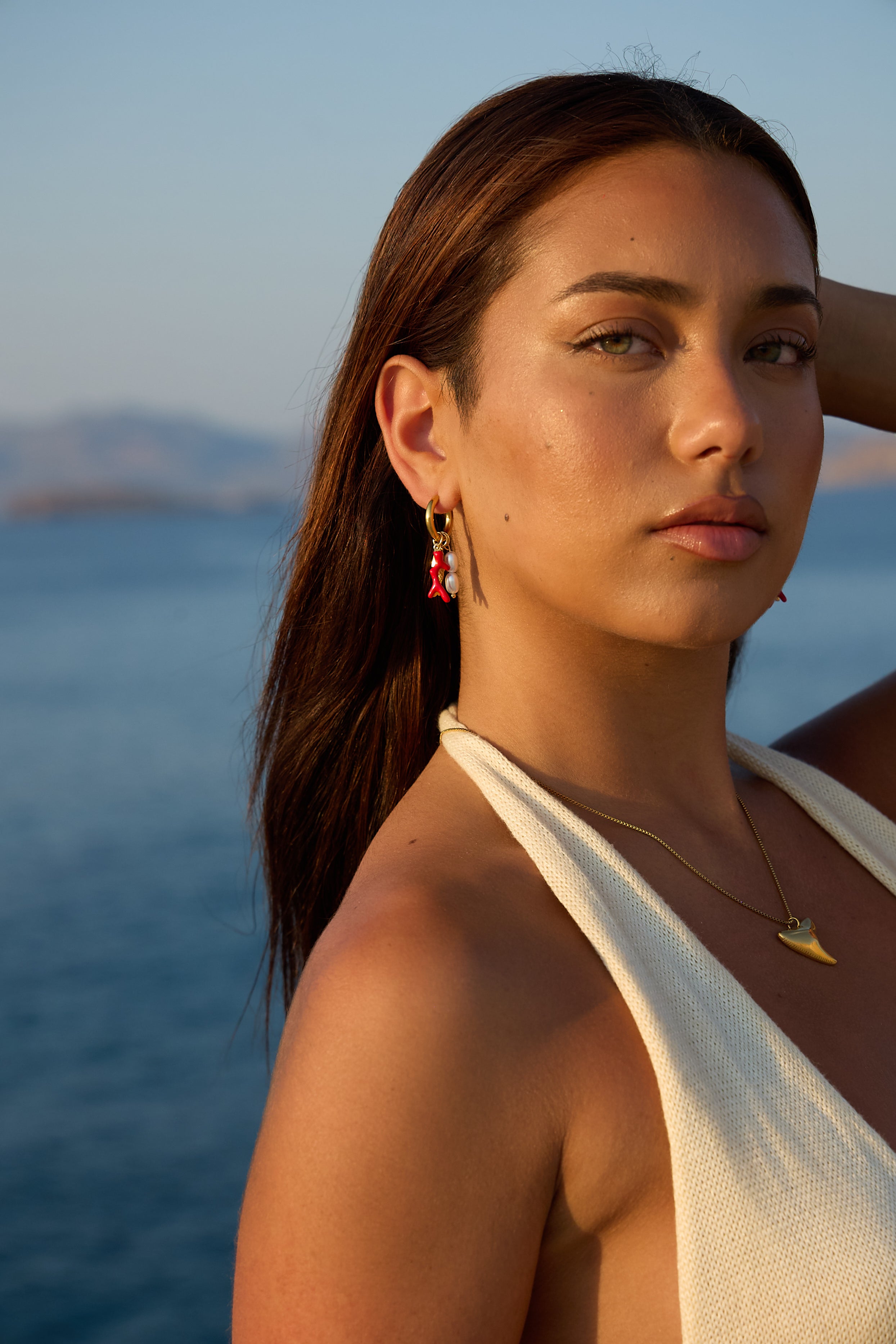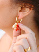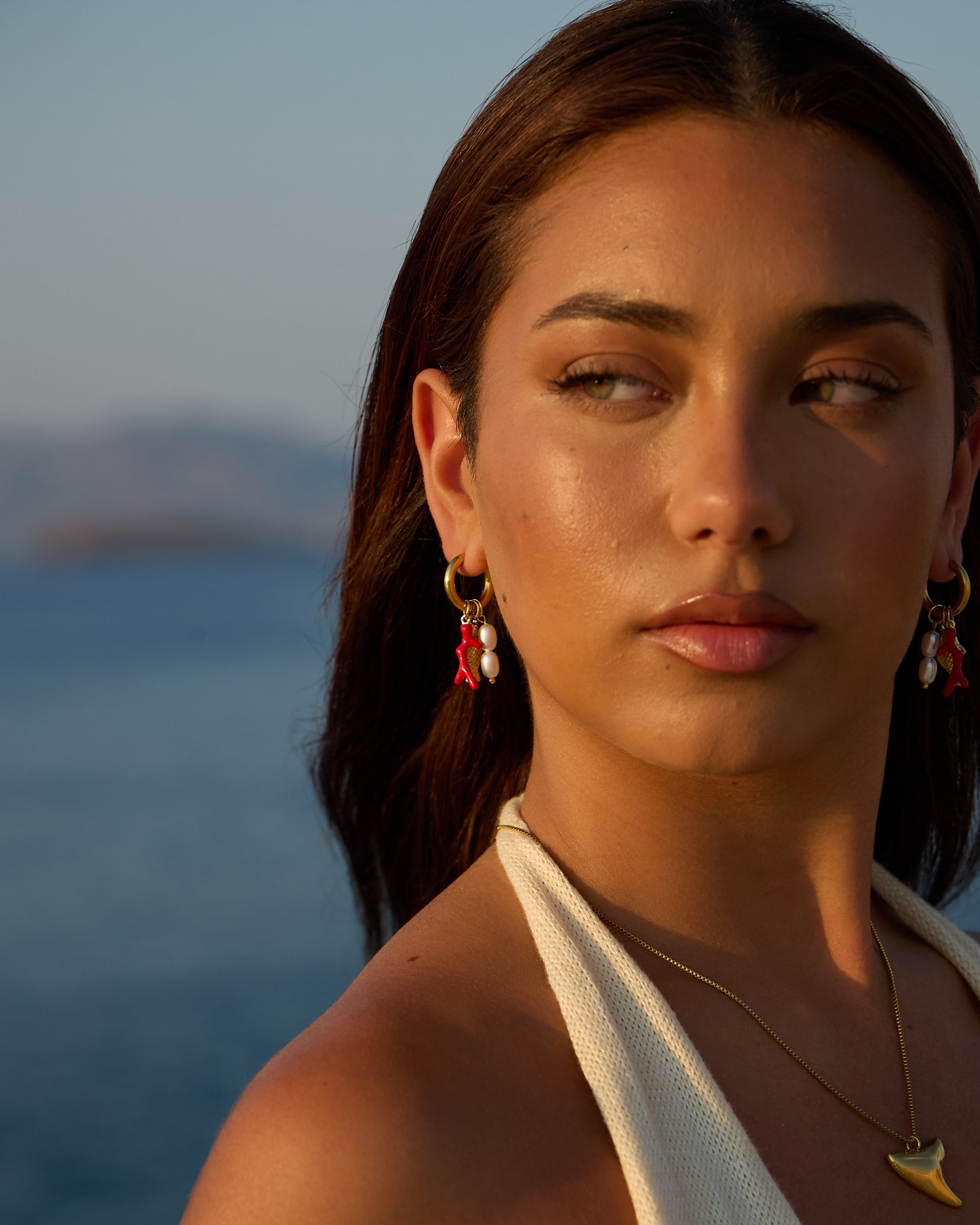 Dive into effortless style with our Capri Coast Charm Earrings—your ultimate vacation accessory. Featuring a playful trio of charms—a shimmering sardine, vibrant red coral, and a lustrous pearl—these earrings bring a touch of the Mediterranean wherever you go. Customize your look by mixing and matching the removable charms, perfect for transitioning from a beach day to a night out.