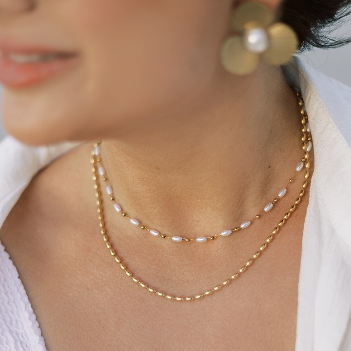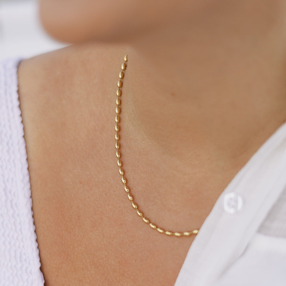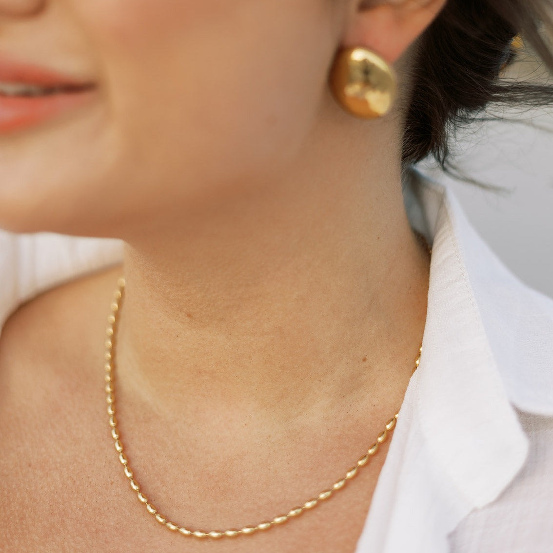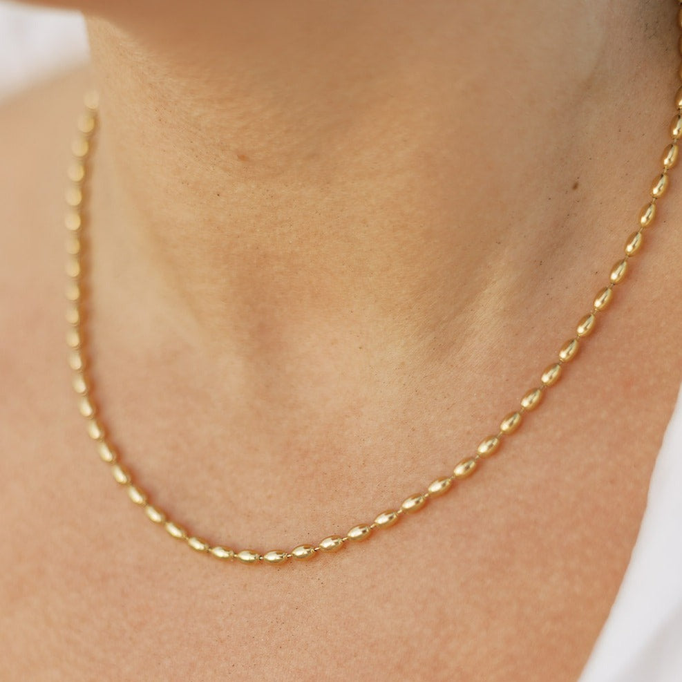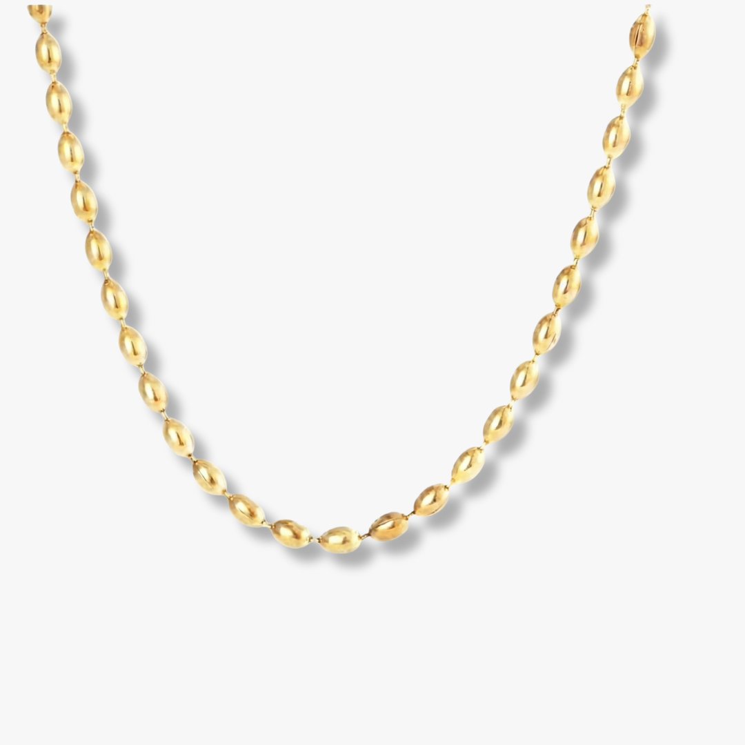 Inspired by Charleston’s rich heritage, this timeless rice bead necklace features small, oval beads designed to resemble grains of rice—a refined nod to the city’s iconic agricultural history. Finished in radiant waterproof gold, its classic silhouette brings effortless elegance to everyday styling, whether worn alone or layered.