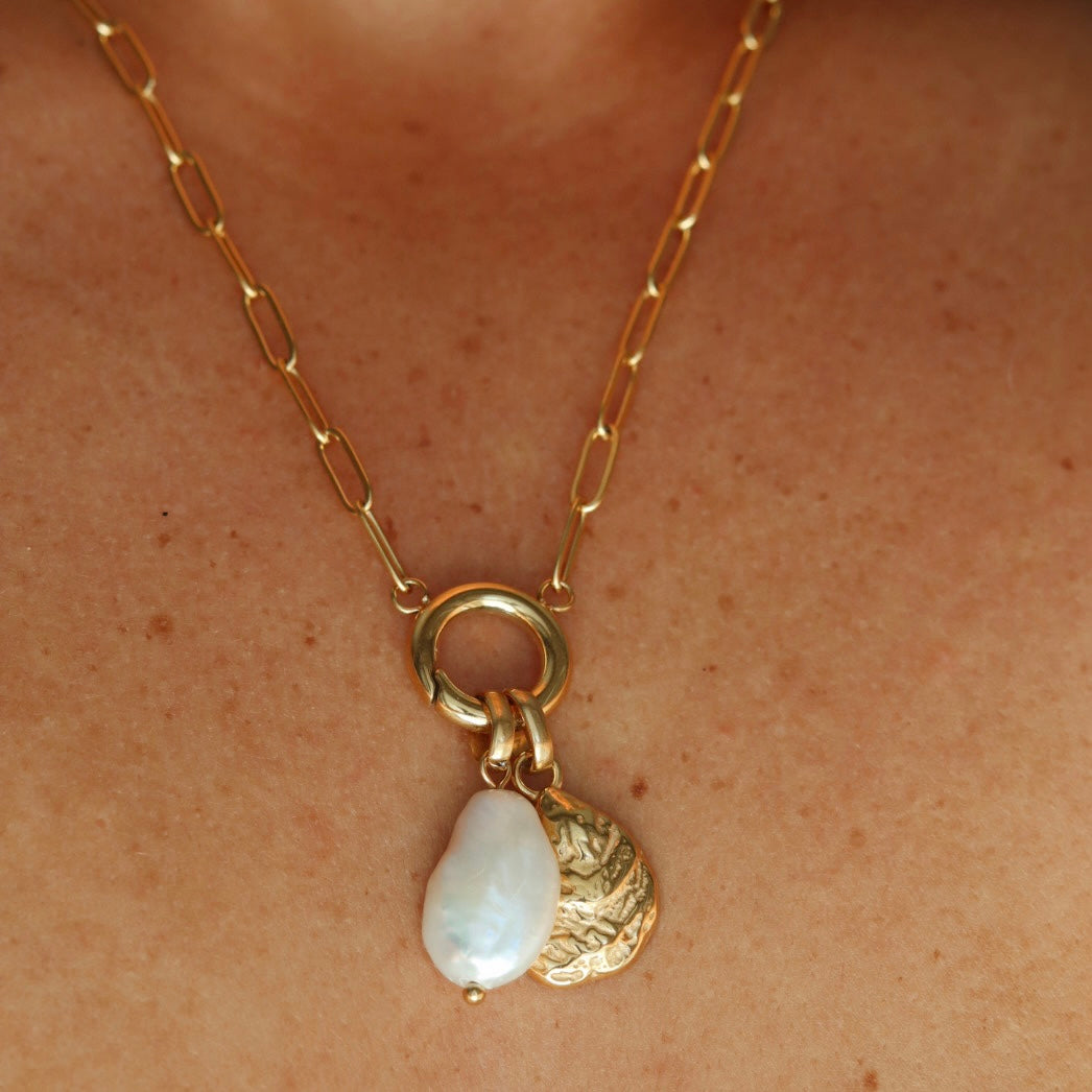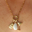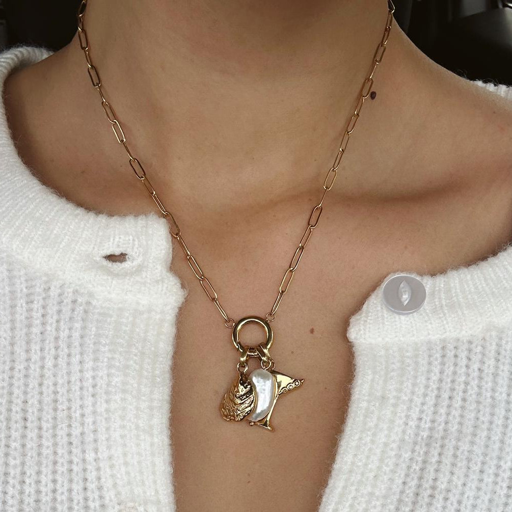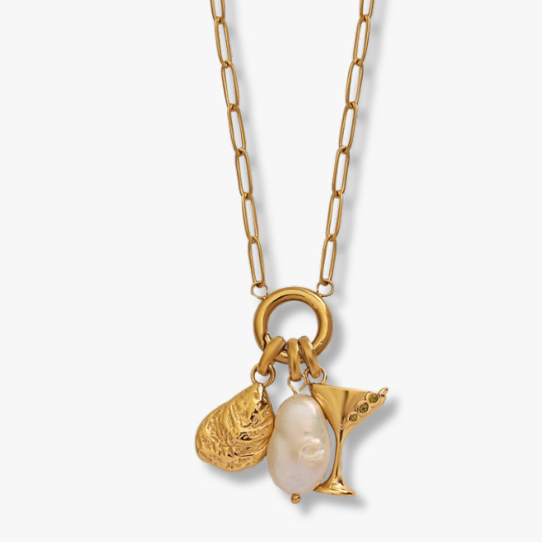 The centerpiece of this necklace is our exclusive Liv Bella Vita martini charm, meticulously crafted with three shimmering zircon stones that represent the olives of a perfect martini. The charm also features an oyster charm, symbolizing the essence of luxury and refinement, and a genuine freshwater pearl, adding a touch of natural beauty.