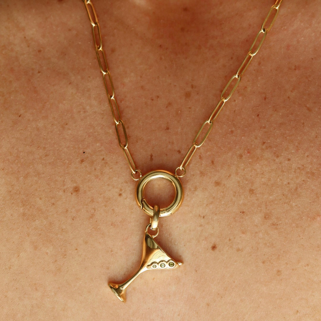 Elevate your style with our exquisite Dirty Martini Charm Necklace, a blend of elegance and playful sophistication. This stunning piece features a delicate paperclip chain, adjustable from 16 to 18 inches, to perfectly complement your neckline.
