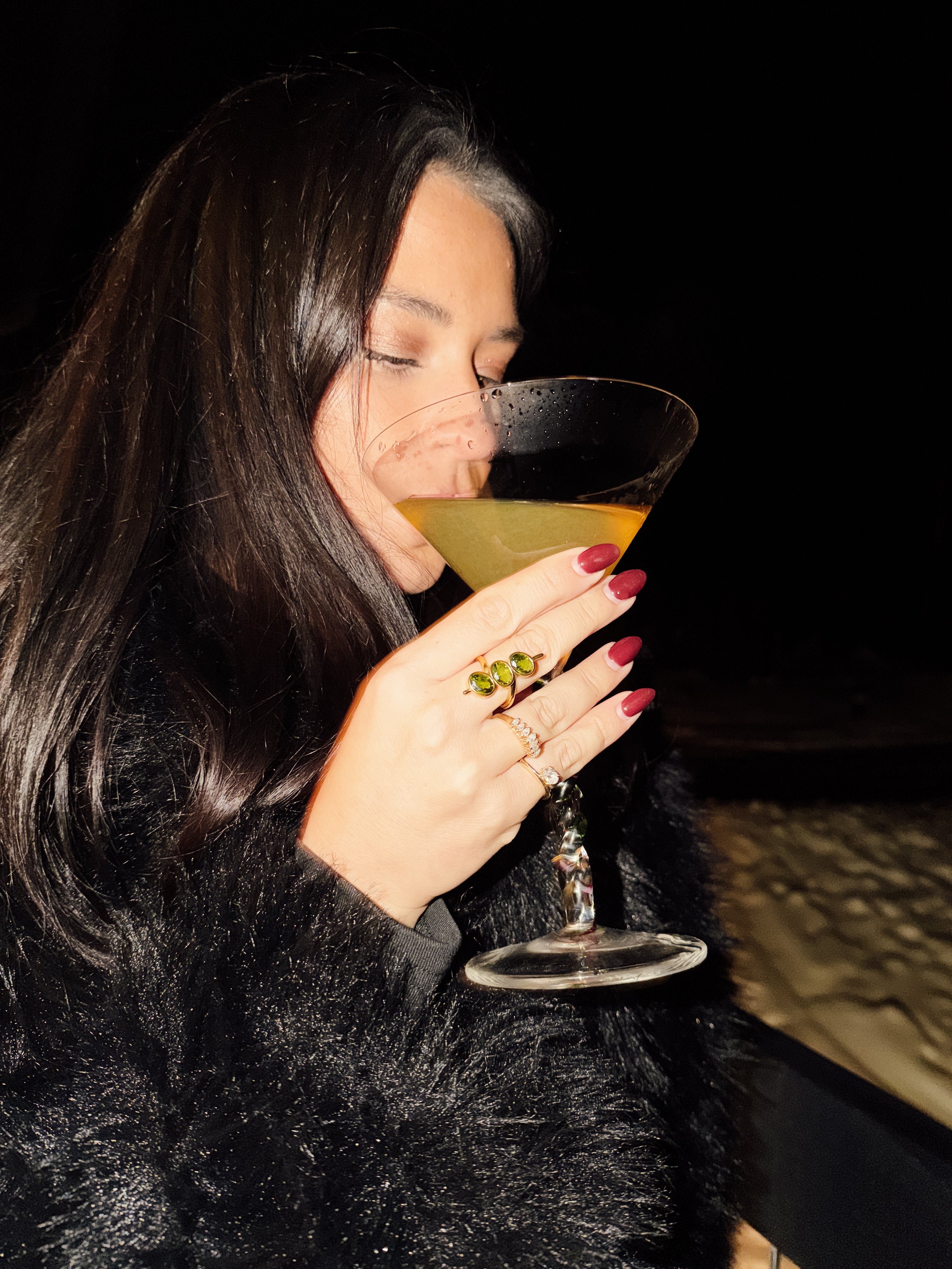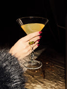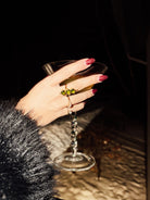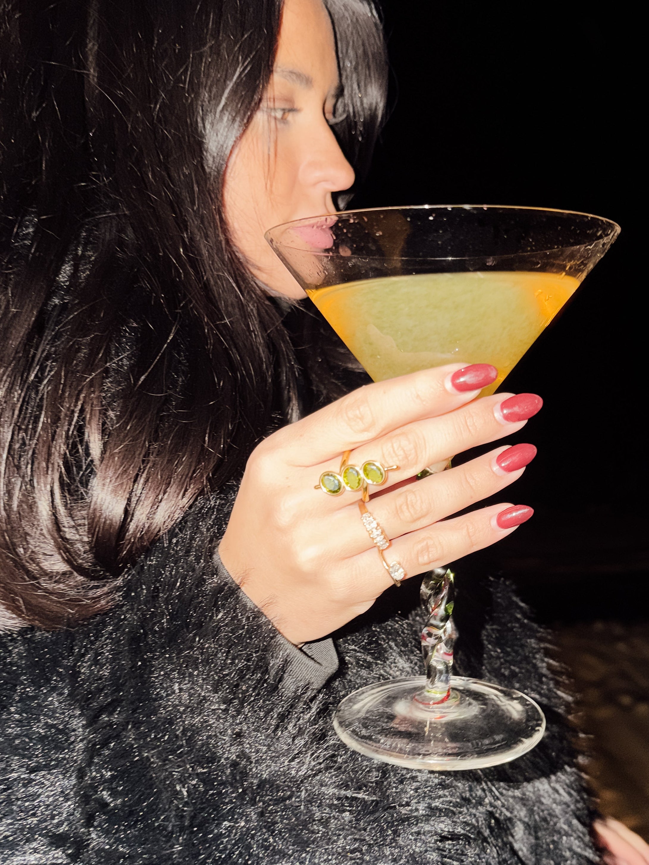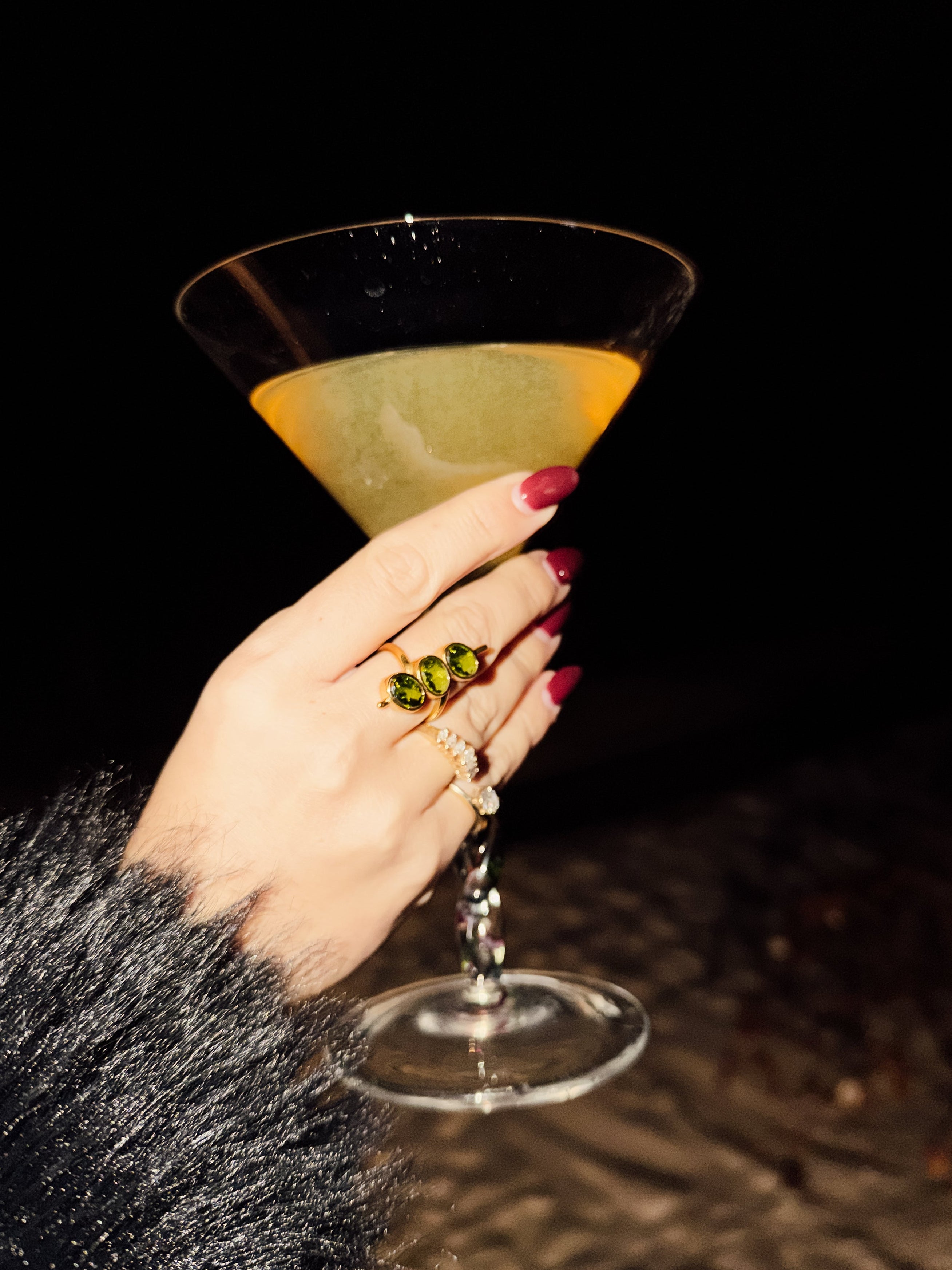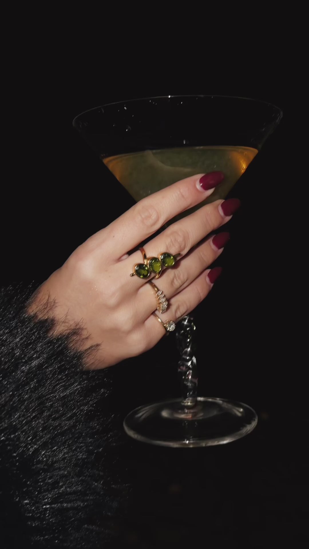 Inspired by the iconic dirty martini, this statement piece delivers effortless charm with three natural olive zircon stones stacked in a striking vertical silhouette that feels both modern and timeless. Designed to catch the light—and compliments—it’s the perfect finishing touch for seamless day-to-night styling.