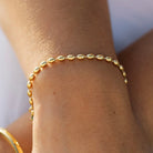 Featuring delicate, interlinked rice-shaped beads in a radiant waterproof gold finish, this bracelet embodies Southern charm with a modern twist. Lightweight, versatile, and perfect for layering or wearing solo, it’s a must-have for anyone who loves effortless elegance with durability.