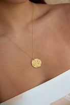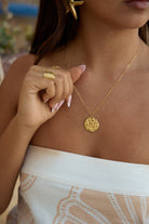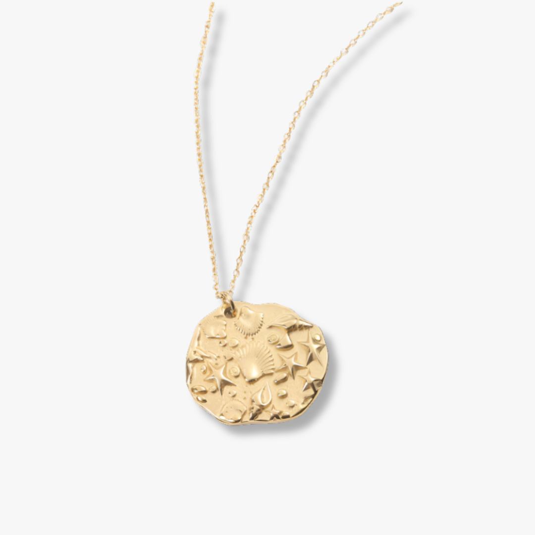 A timeless nod to the sea, the Gwendolyn Ocean Coin Necklace features an embossed medallion that feels like a treasure found on sun-drenched shores. Hanging from a classic gold chain, this piece adds effortless elegance—whether layered or worn solo.