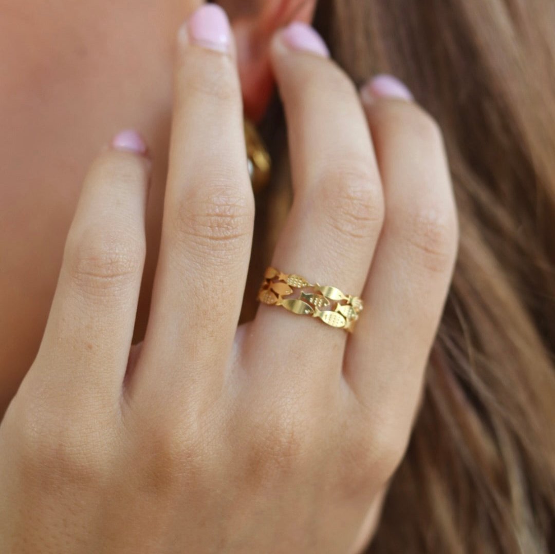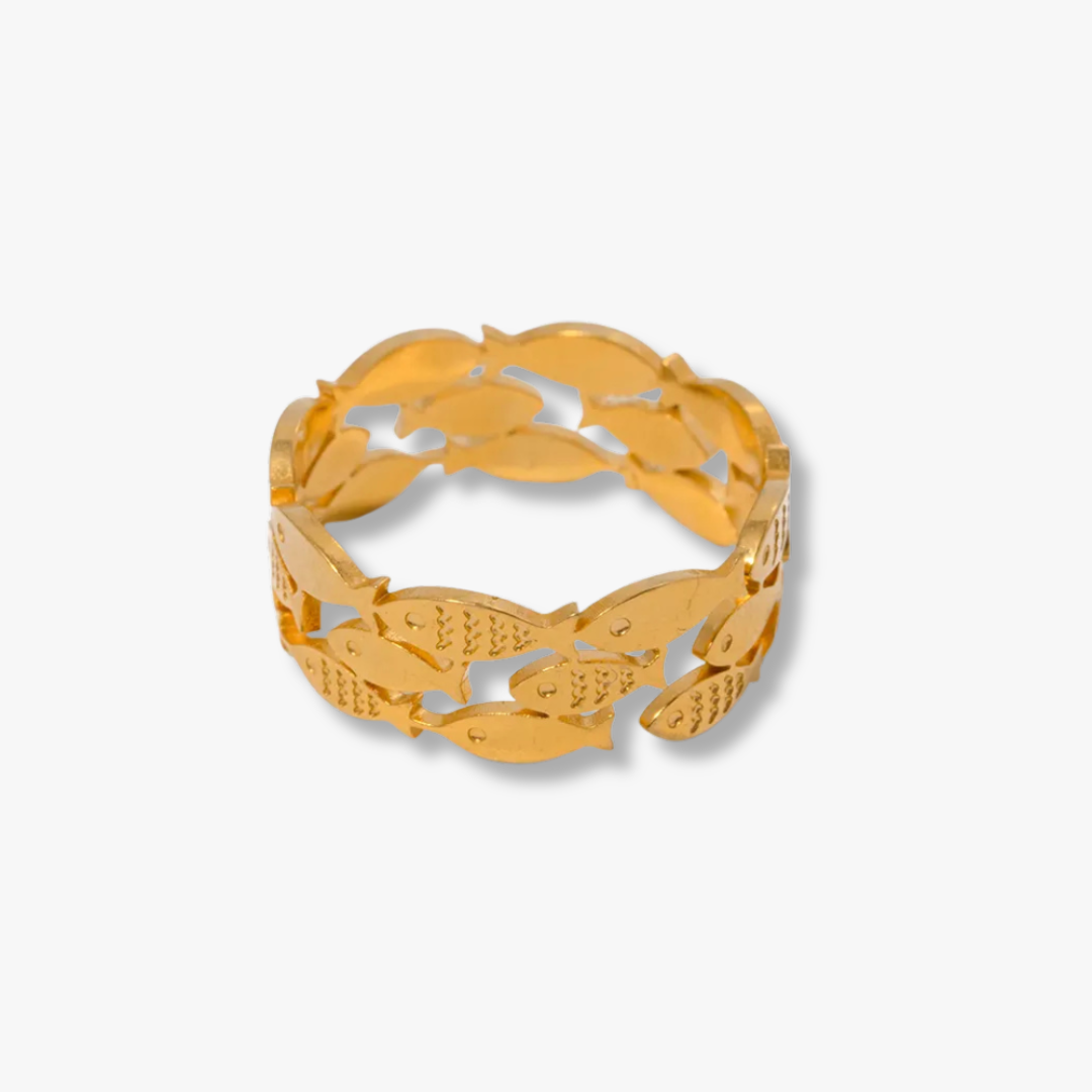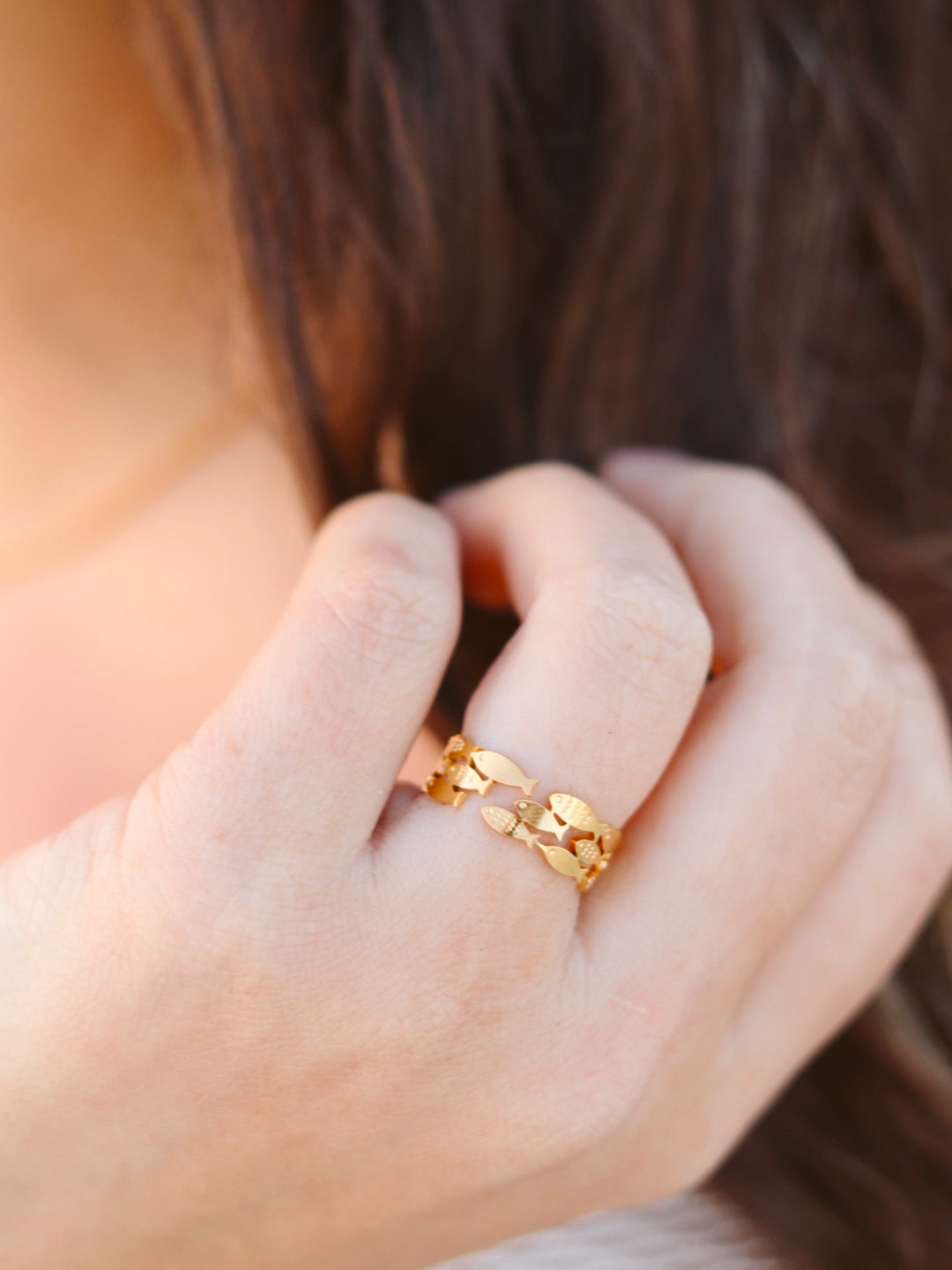 Playful yet elegant, the Kai Fish Ring is a unique piece inspired by the fluid beauty of the sea. Crafted from PVD-plated stainless steel with 18k gold, this waterproof and tarnish-resistant ring feature a delicately detailed fish design, symbolizing strength and freedom.