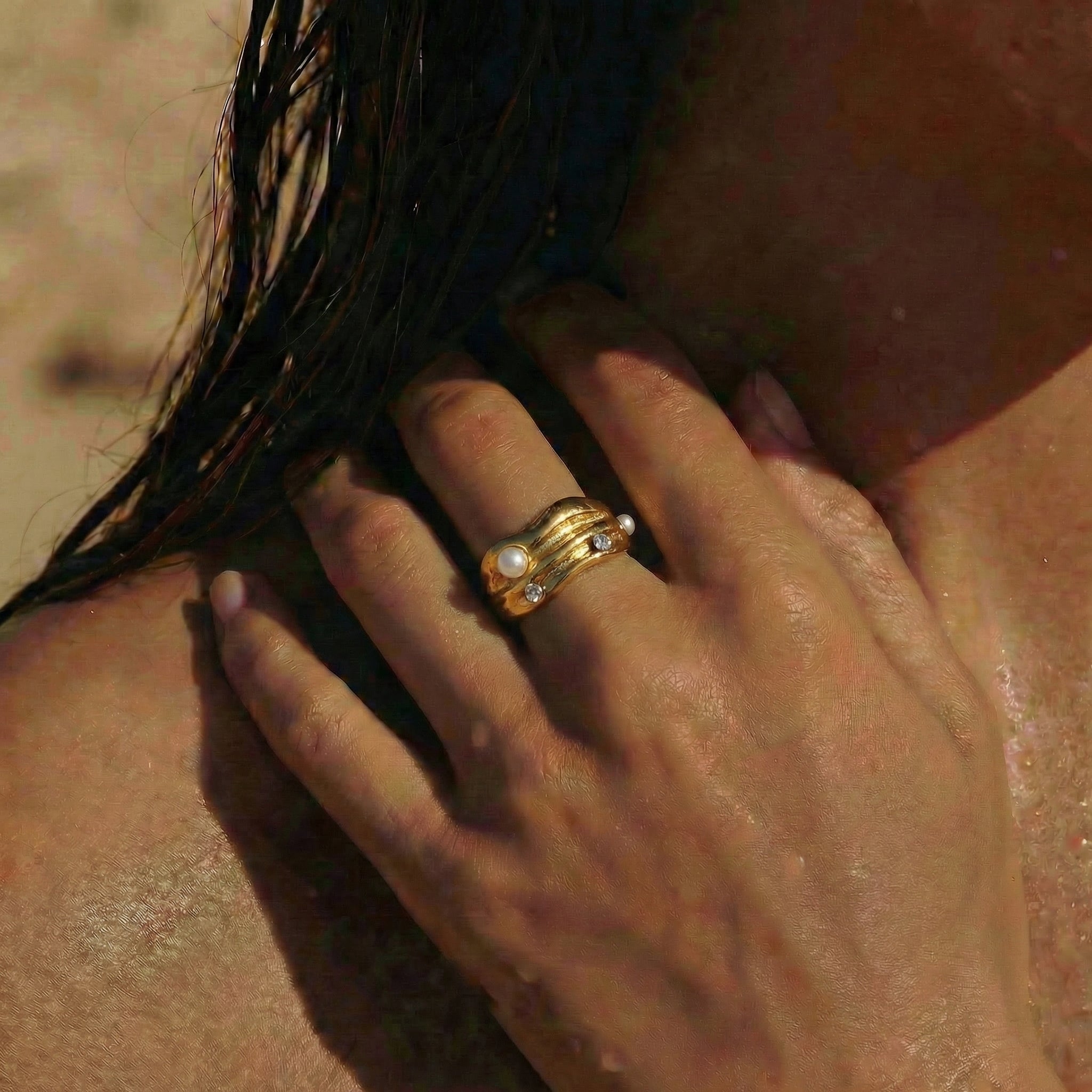 Inspired by fluid movement and sculptural form, this statement ring features a softly contoured gold band accented with luminous pearl details and subtle crystal touches. Its organic silhouette feels bold yet refined, creating an effortless balance between modern edge and timeless elegance.