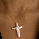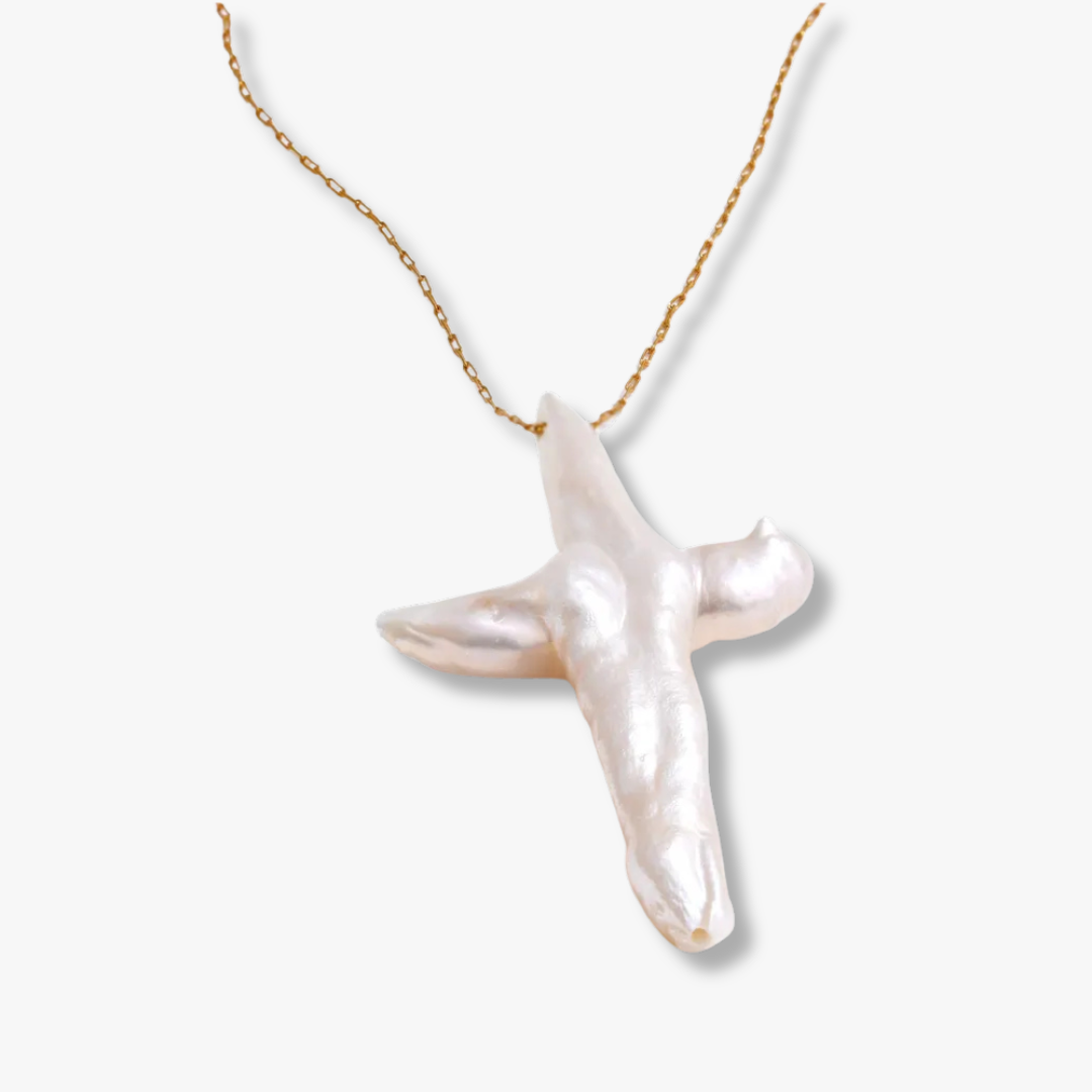 A modern heirloom with timeless grace, the Baroque Pearl Cross Necklace features a one-of-a-kind natural freshwater pearl shaped into a striking cross silhouette. Each piece is completely unique — no two are ever the same — making it a meaningful statement of faith and effortless elegance.