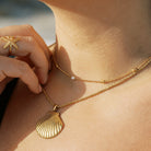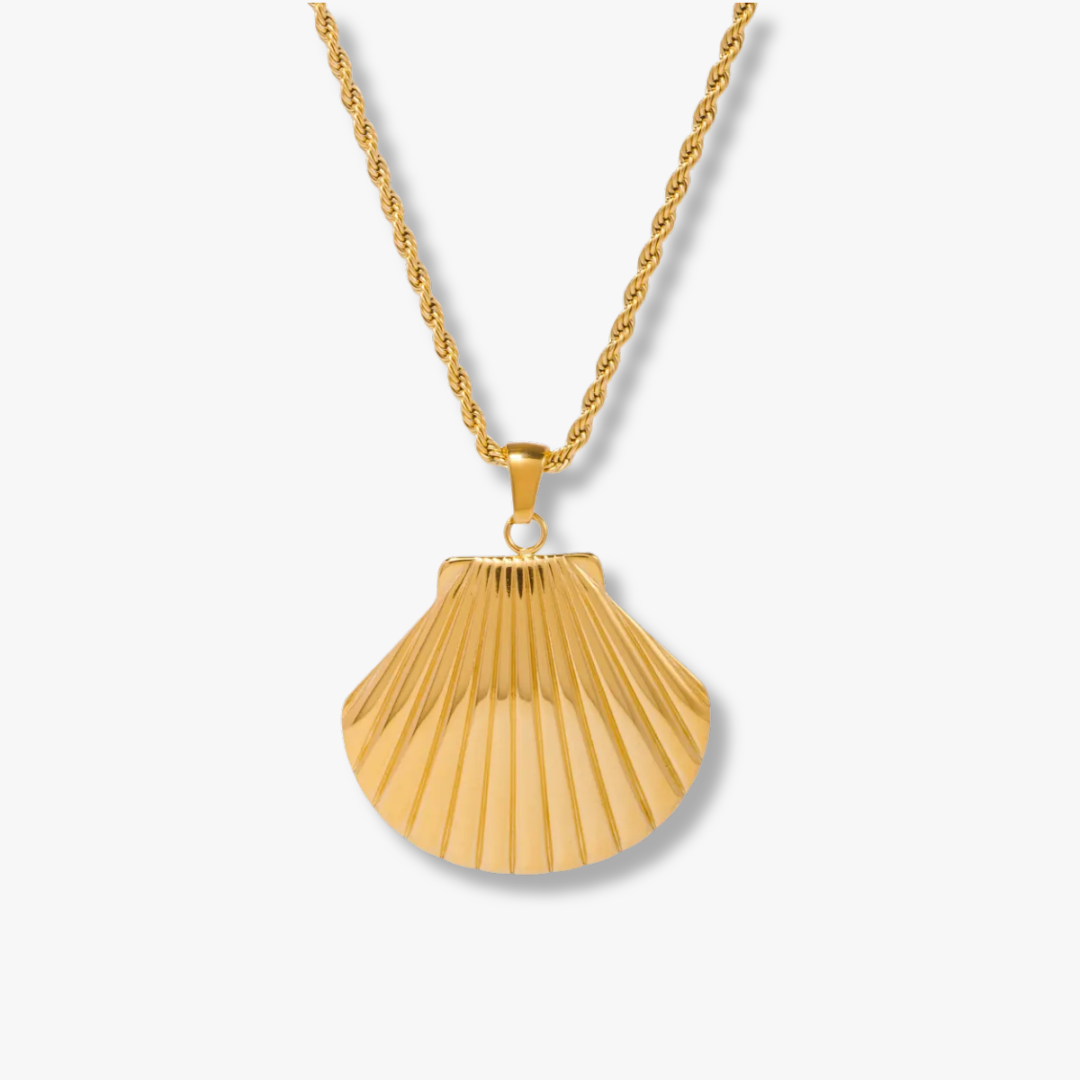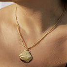 The Delphine Shell Pendant Necklace is a timeless nod to coastal beauty. Featuring a delicately detailed large shell pendant in a luminous, waterproof gold finish, this piece adds effortless elegance to any look.