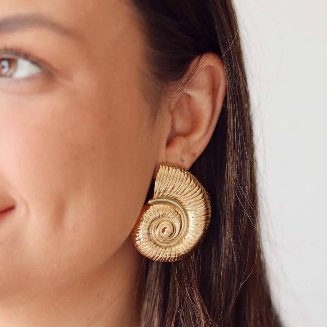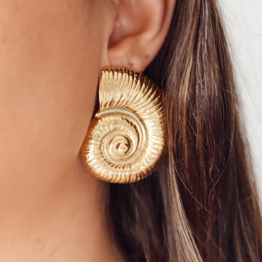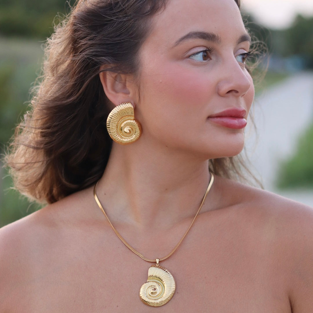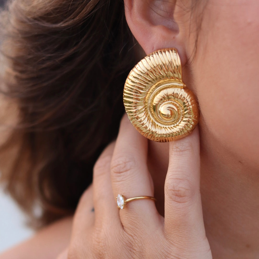 Featuring intricately detailed conch shell designs, these oversized studs capture the natural beauty of the ocean while adding a touch of coastal sophistication to any look. Crafted with a waterproof, hypoallergenic, and non-tarnish 18k gold and titanium coating, they’re designed to withstand water, salt, and everyday wear without losing their shine.
