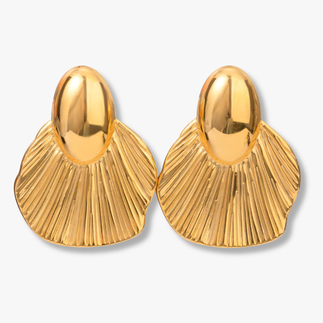 Bold, vintage-inspired, and effortlessly elegant, these shell statement studs bring instant golden glamour to any look. With a glossy domed top and detailed fan-shell texture, they’re designed to catch the light and elevate everything from linen sets to evening dresses.