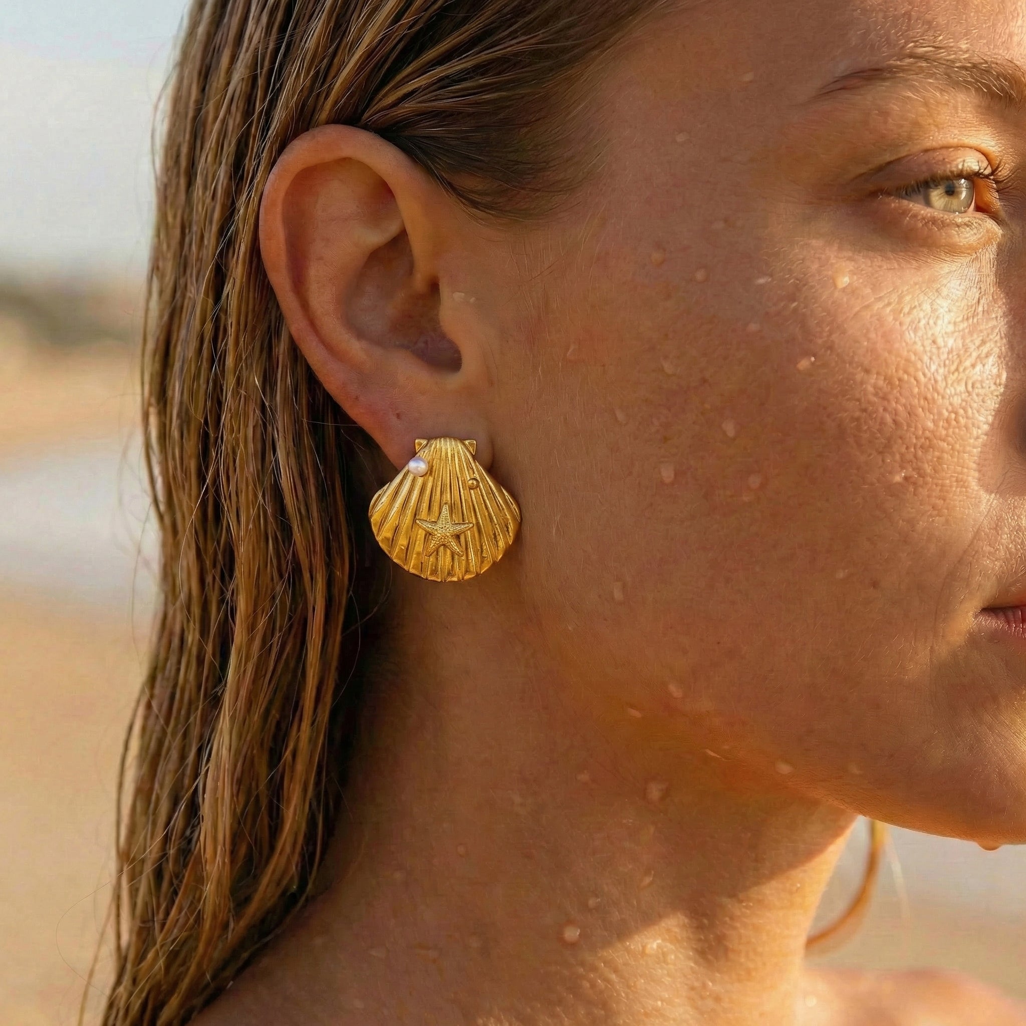 Bold, coastal, and undeniably luxe, these oversized shell studs bring instant resort glamour to any look. Featuring a high-shine sculptural shell design accented with a textured starfish and tiny pearl detail, they’re the ultimate statement piece for beach dinners, vacations, and golden-hour moments.