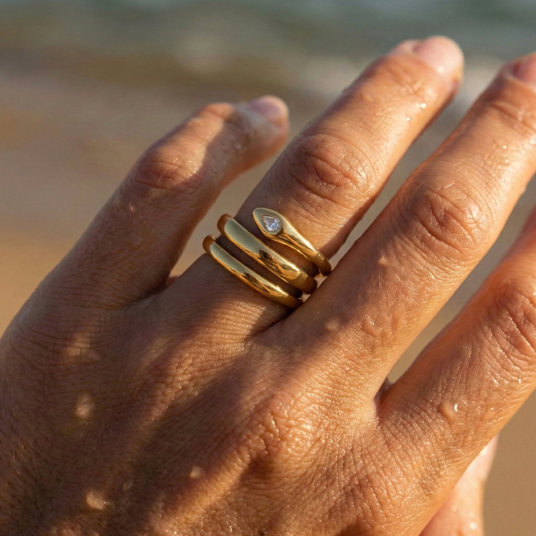 Bold symbolism wrapped in indestructible gold. The Seraphina Ring features a sleek, coiling snake design that wraps effortlessly around your finger, finished with a sparkling pear-cut stone set into the head. A powerful symbol of rebirth and transformation, this statement piece is made for the woman who’s always evolving.