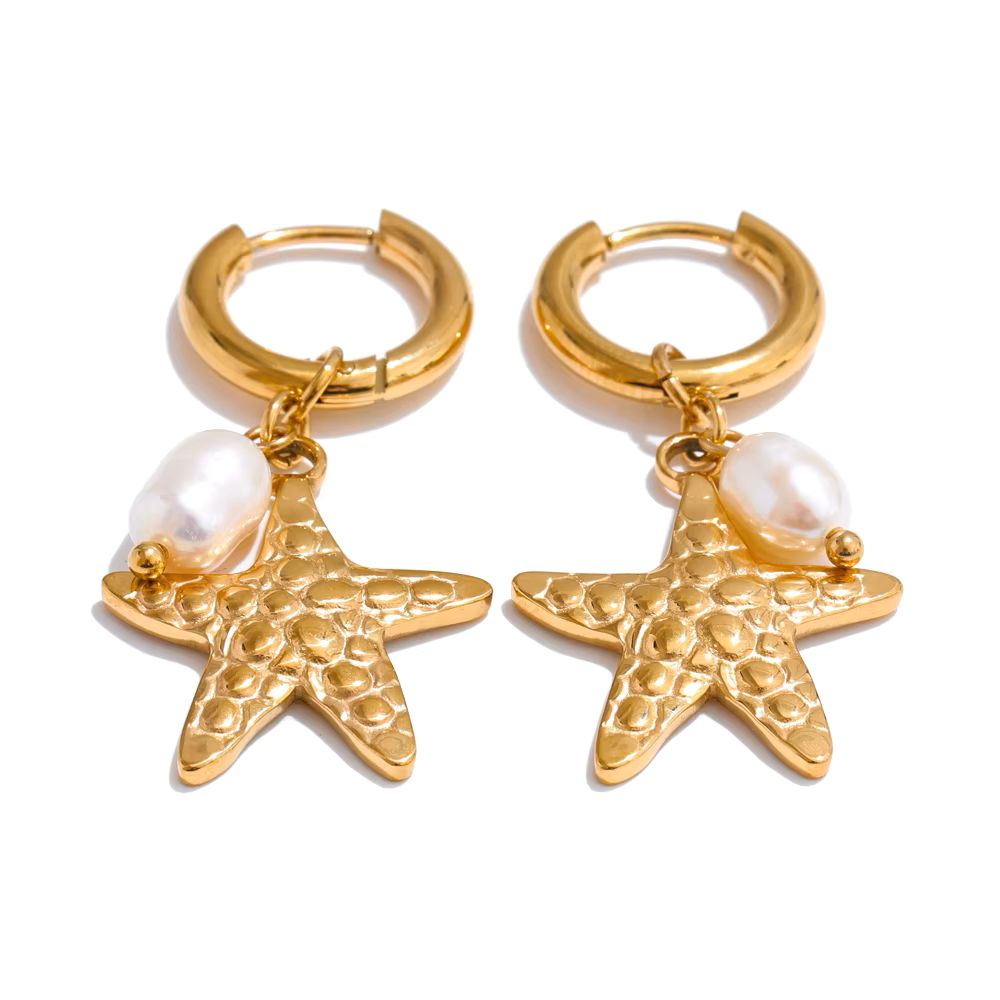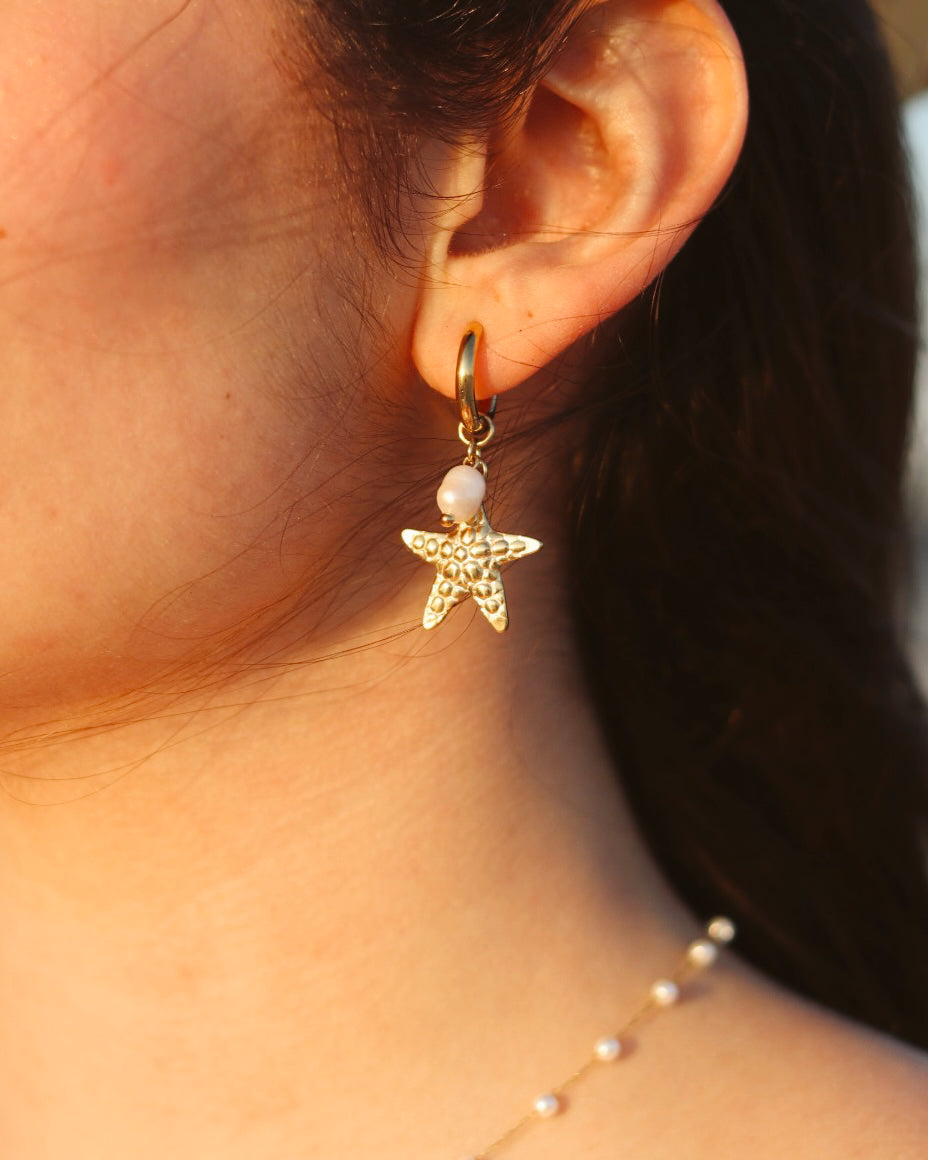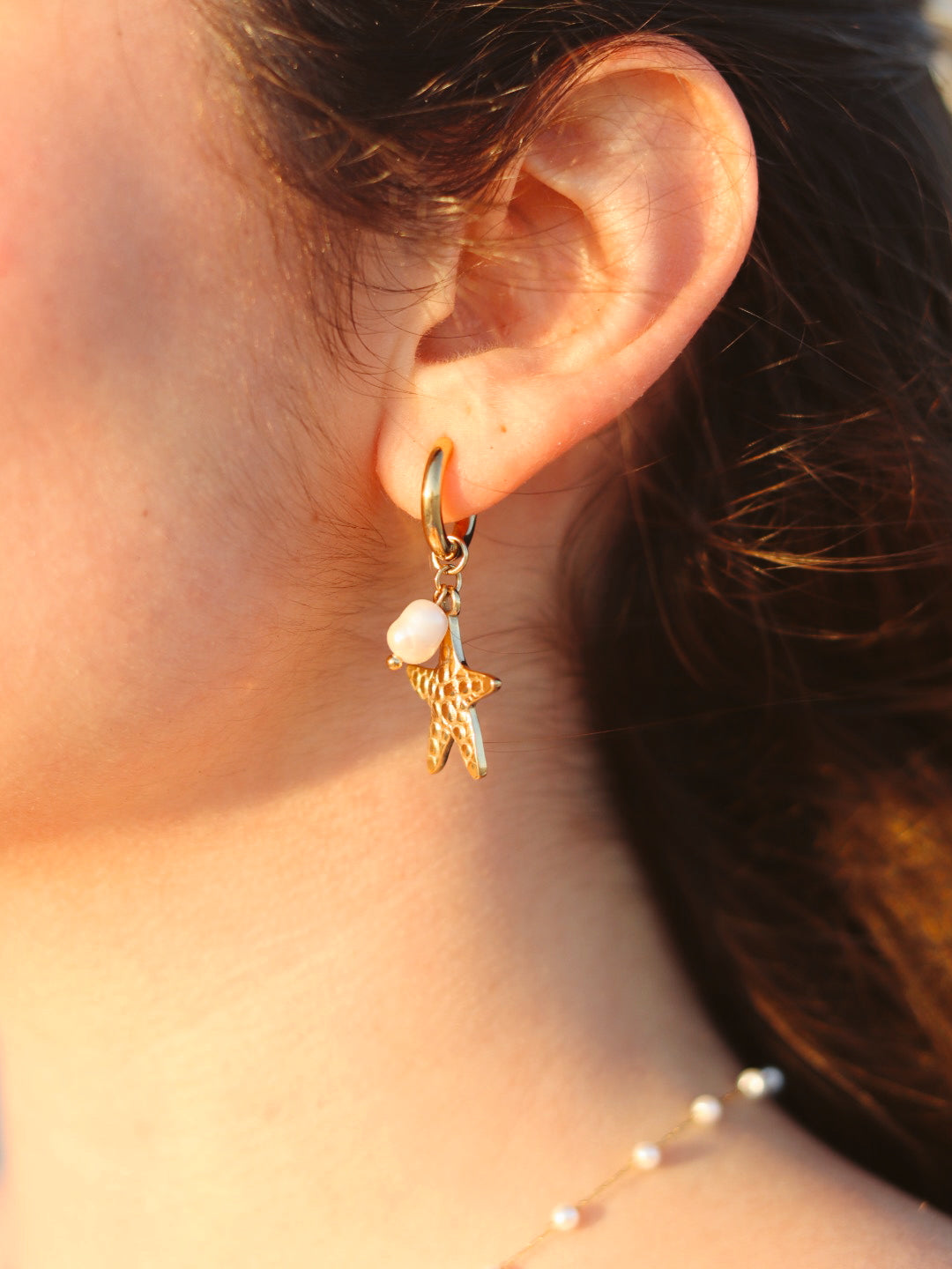 A delicate duo of the sea. Featuring a petite pearl and a dainty starfish charm, these earrings bring effortless coastal elegance to every look.