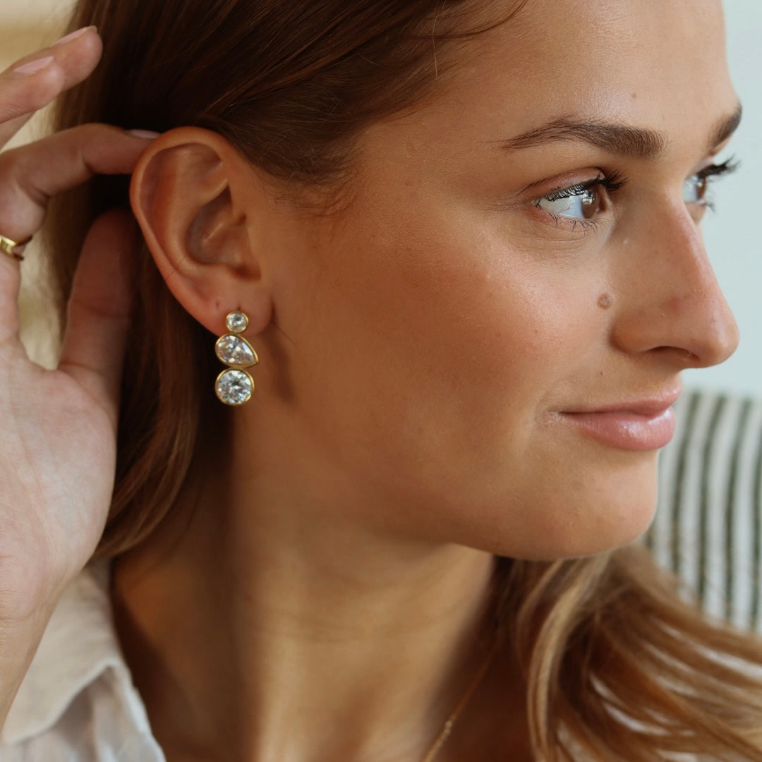 This stunning piece features a delicate drop design adorned with three sparkling diamond zircon stones.