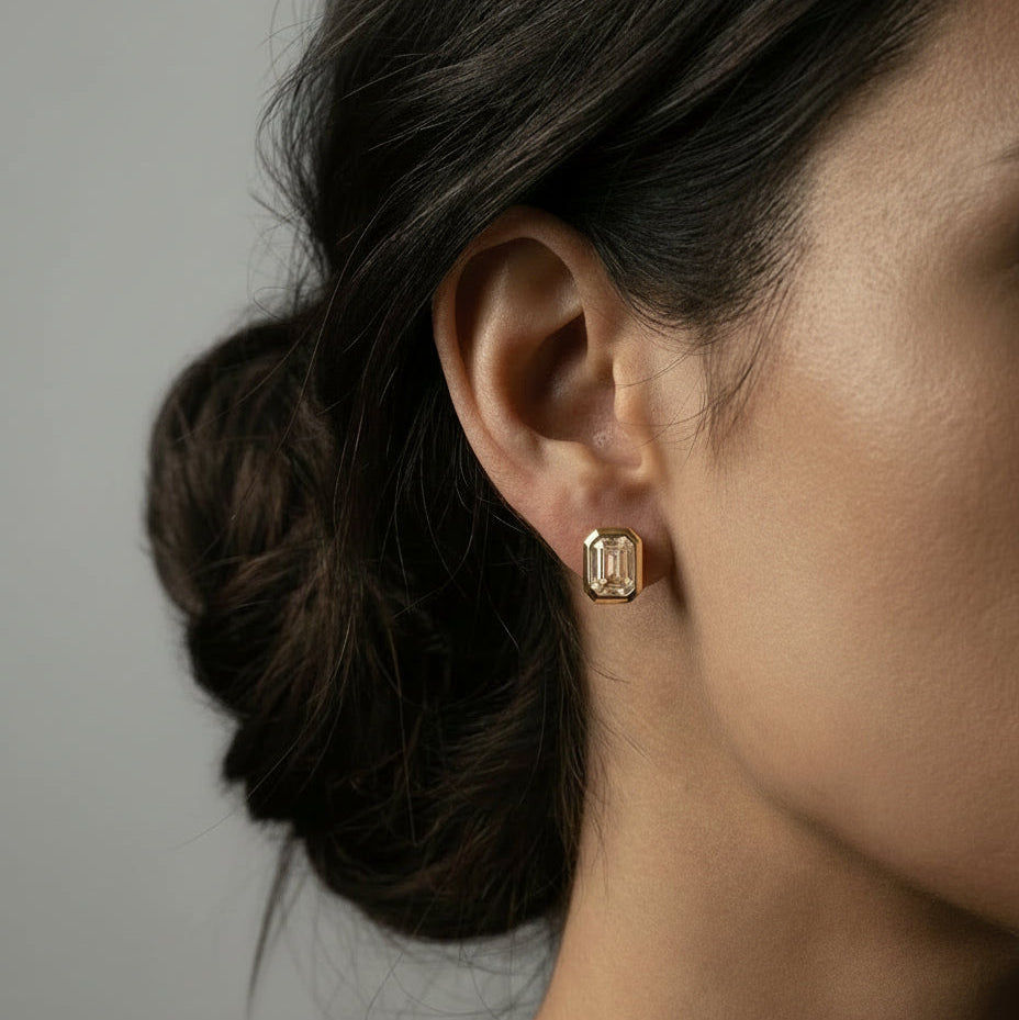 Defined by understated brilliance, these emerald-cut bezel stud earrings offer a refined take on everyday sparkle. Featuring precision-cut zircon stones set in a sleek, secure bezel, their clean lines and radiant shine bring effortless sophistication to any look.